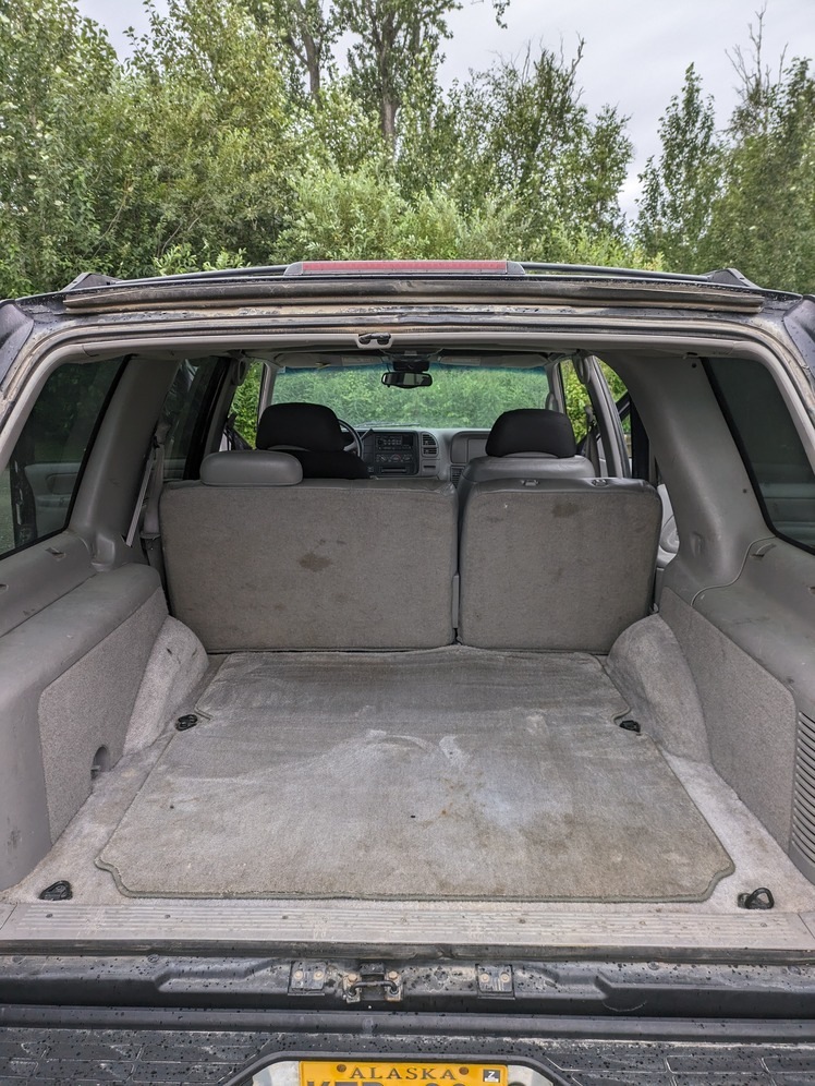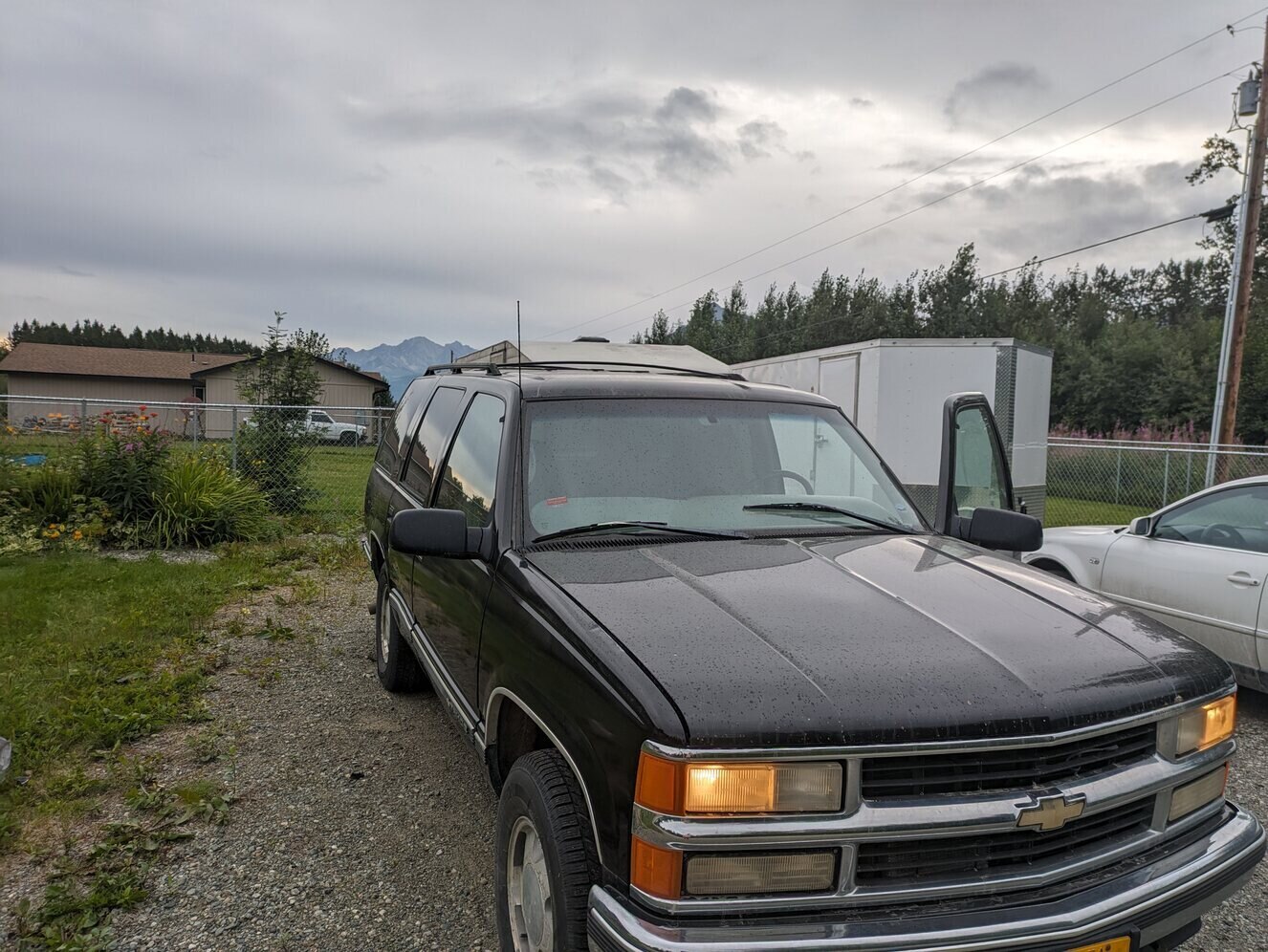 Selling our 98 Chevy Tahoe. It has 4 wheel drive and auto start. The heat, defrost and AC all work. The CD player and radio work as well. It has studded snow tires ( used 2 seasons) which are currently on the vehicle. We will give you the regular tires with the vehicle. We also have a custom built bed frame with pull out drawers for car camping if you want them!