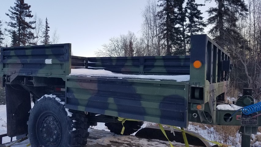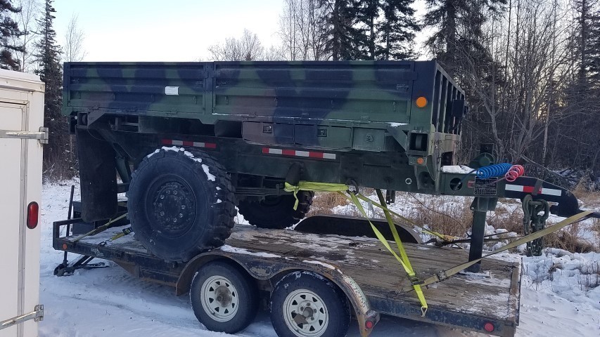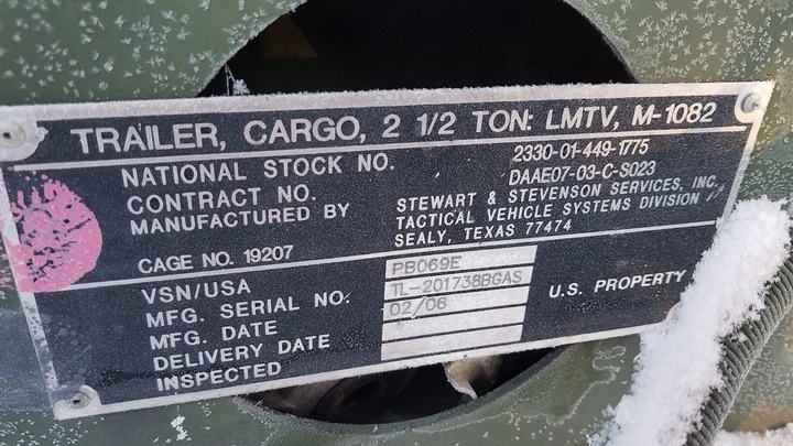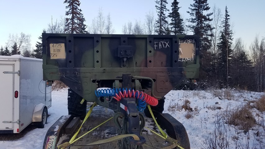 Military model M-1082 2.5 Ton trailer designed to be towed by any of the LMTV Military Vehicles. These are the ultimate in large vehicle off road trailers, practically indestructible. Can be towed by: Deuce and a Half, 6x6's, Dozers, Semi's, Tractor's, LMTV rigs, etc... Perfect for the mining, logging, homesteading, hunting camp, anyone who has a rig big enough to tow it with. Would be an awesome hunting camp trailer, has a payload of 5000lbs. This one is in like new condition, not even the grease points are dirty. Has all the bells and whistles, ladder for climbing on, under bed storage for all the side panels if using as a flat bed, air brakes, anti lock brake system, on board air tank and brake actuator, articulating tongue jack to stow completely out of the way, hidden 4 corner lifting eyes, 12 and 24 volt trailer plug systems, etc... It's a beast and has it's place; off road in the middle of nowhere!!!