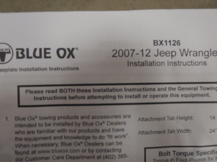 Blue OX BX1126 base plate for 2007-20012 Jeep Wrangler. Never installed, I put an AEV bumper on my Jeep and do not need this base plate.