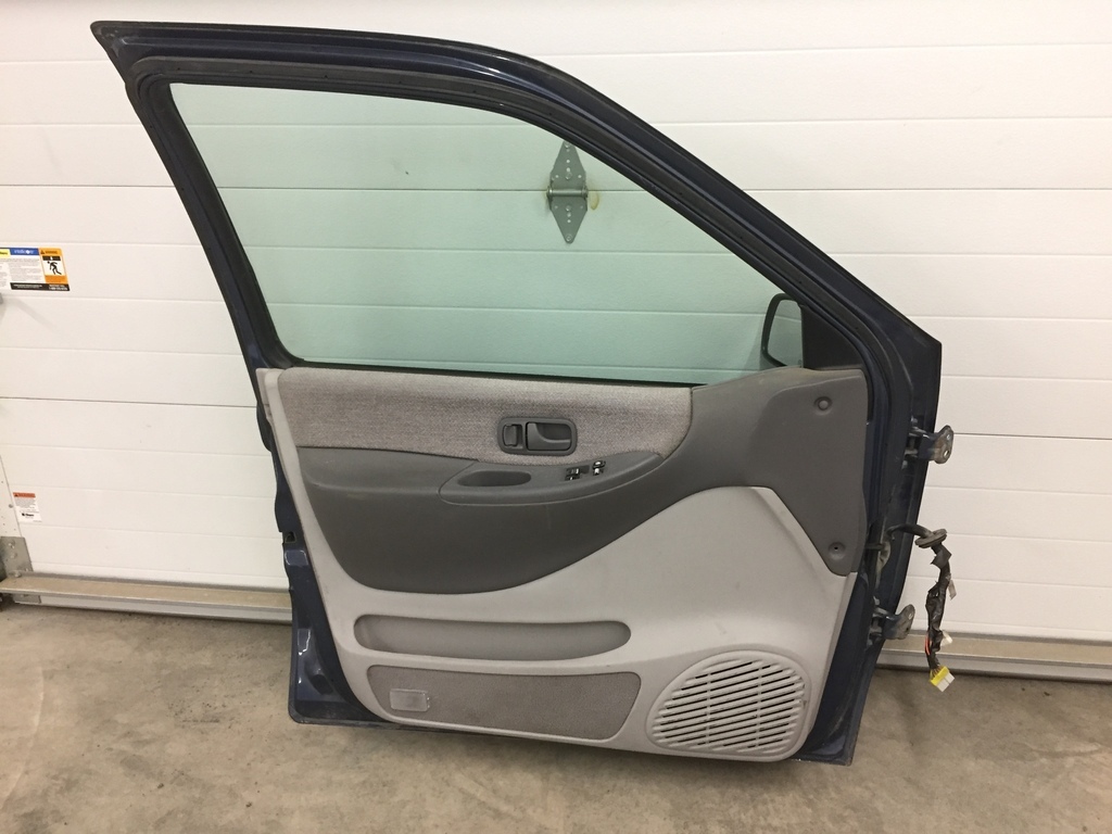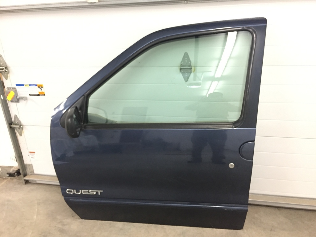 Driver's door with electric rear view mirror, for 1998 Nissan Quest van. Good condition. Dark blue.