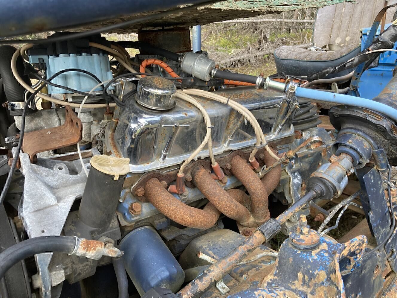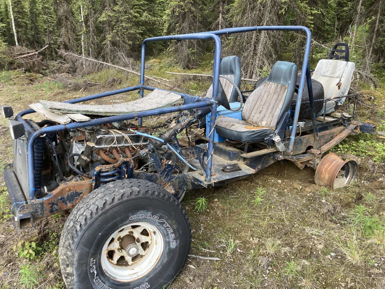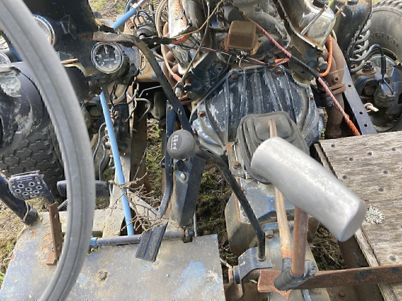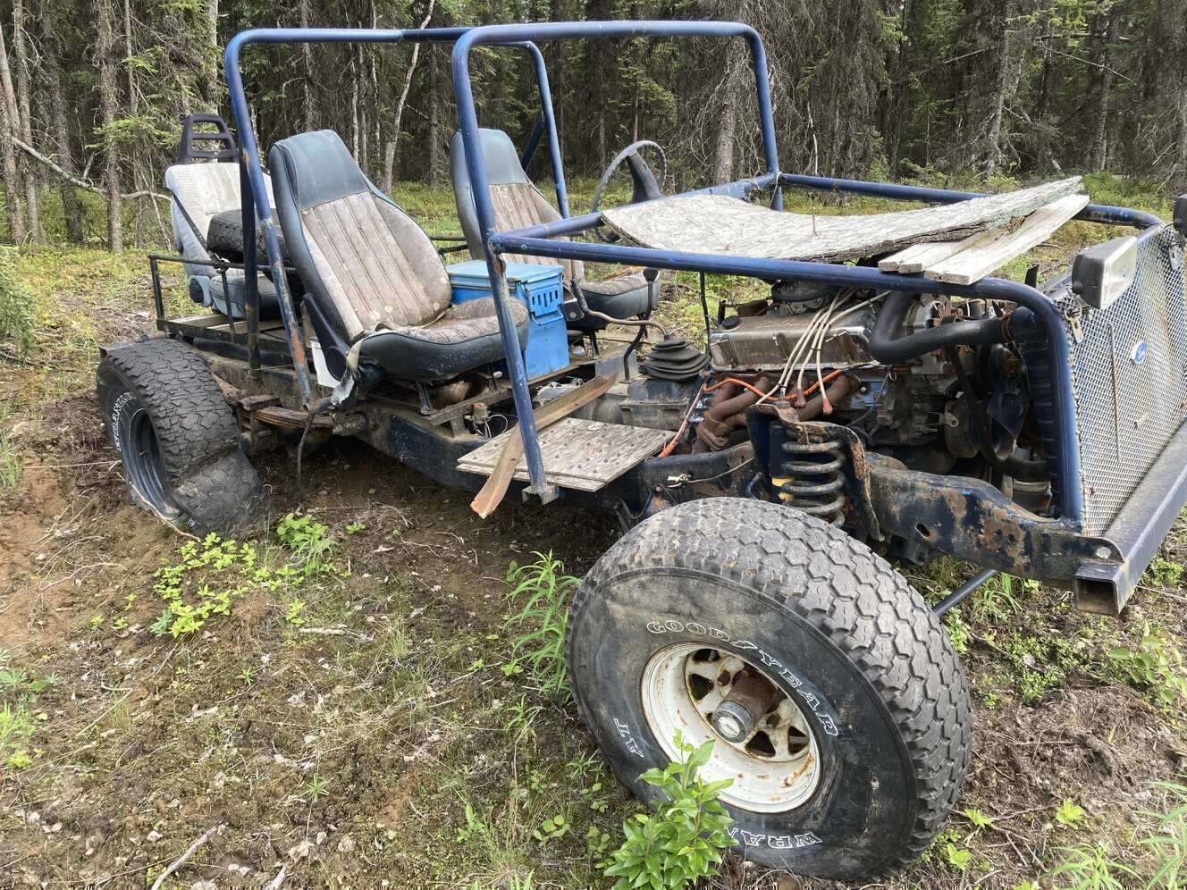 Ford engine and chassis. Not sure of engine size other than that it's one of the small blocks, manual transmission seems fine as well as the transfer case. Engine does not run that I am aware of it had been sitting for a number of years before I got it. Must have trailer or means to move it. text is best
