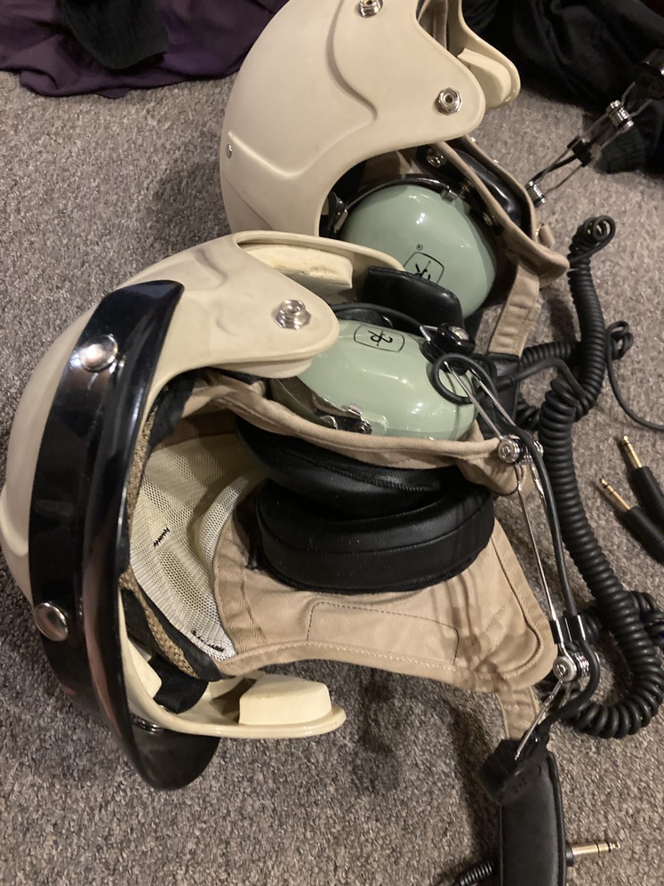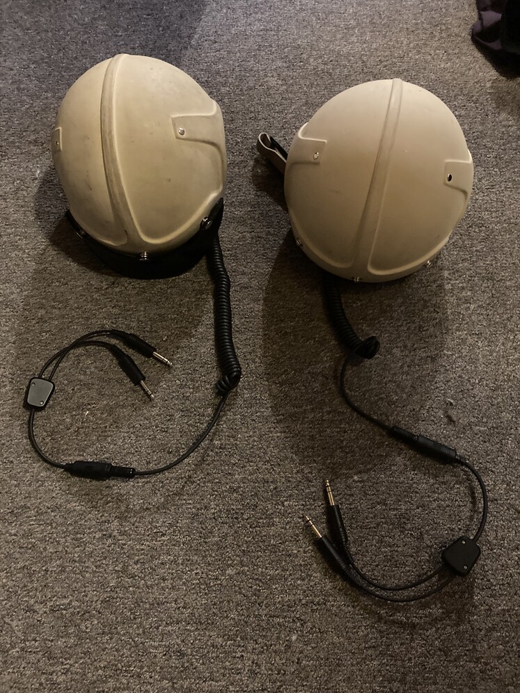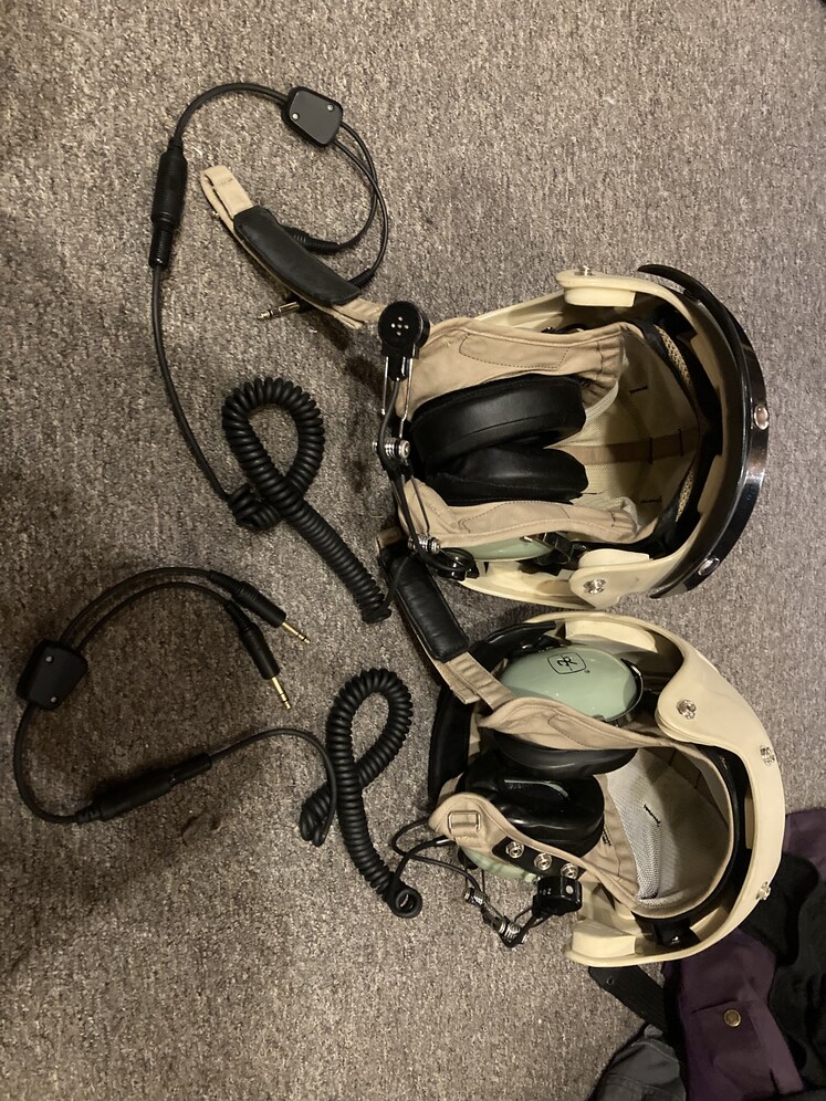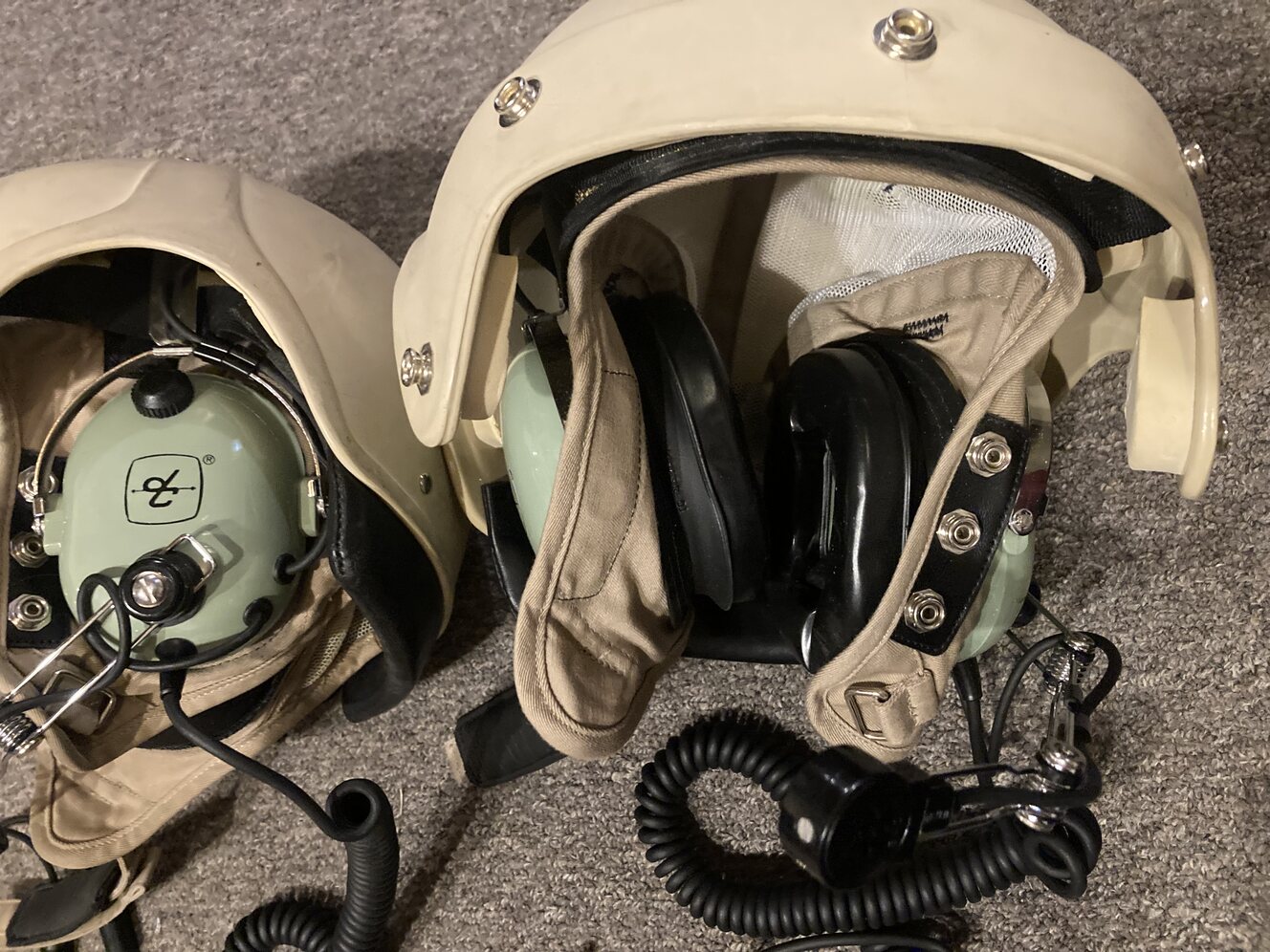 Two David Clark Helmets with DC headsets. Have been worn and used but in good condition. One has Oregon Aero hush kit. Both headsets are helicopter style single plug, and adapter to GA dual plug is included.