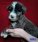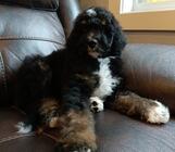 This gorgeous 5 month old boy is a black traditional tri-color with rich copper points on his cheeks, ears, eyebrows, legs, and under his tail—absolutely stunning markings. He has rear dew claws and a beautifully curly coat that is non-shedding and hypoallerg ...