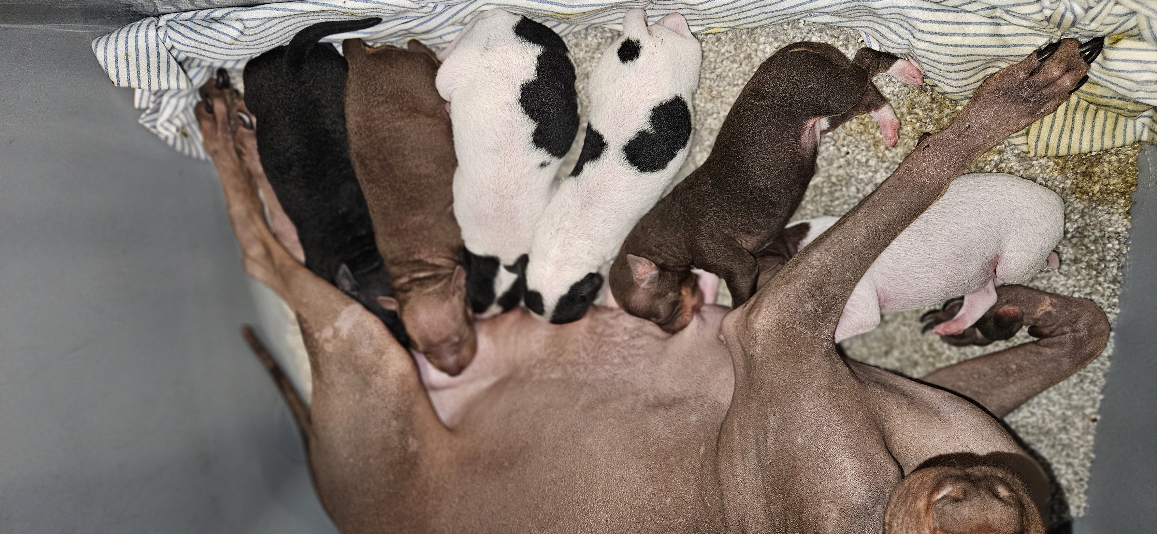 We have 2 boys and 3 girls . Both boys are black and white pied We have one red tri girl one chocolate tri girl one brown and white pied girl and one black with white markings girl .! For those of you that do not know american hairless terrier puppies are born with a thin fur coat layer that falls out within a few weeks! Limited Registration pups 1000. Full akc reg pups are 1500. Both parents on sight dad is 12 lbs mom is 15 lbs!