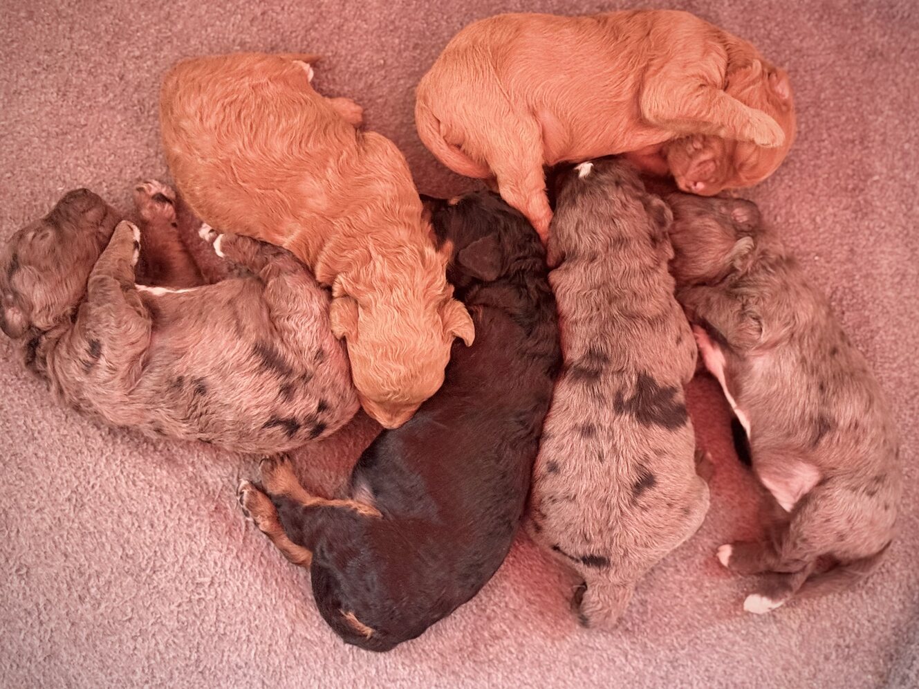 We have over 30 years of breeding experience. These quality puppies are lovingly raised in our family home, where they’re surrounded by kids, snuggles, and everyday sounds. They’re well socialized, handled daily, and already showing their individual personalities! We include a one year health guarantee.
