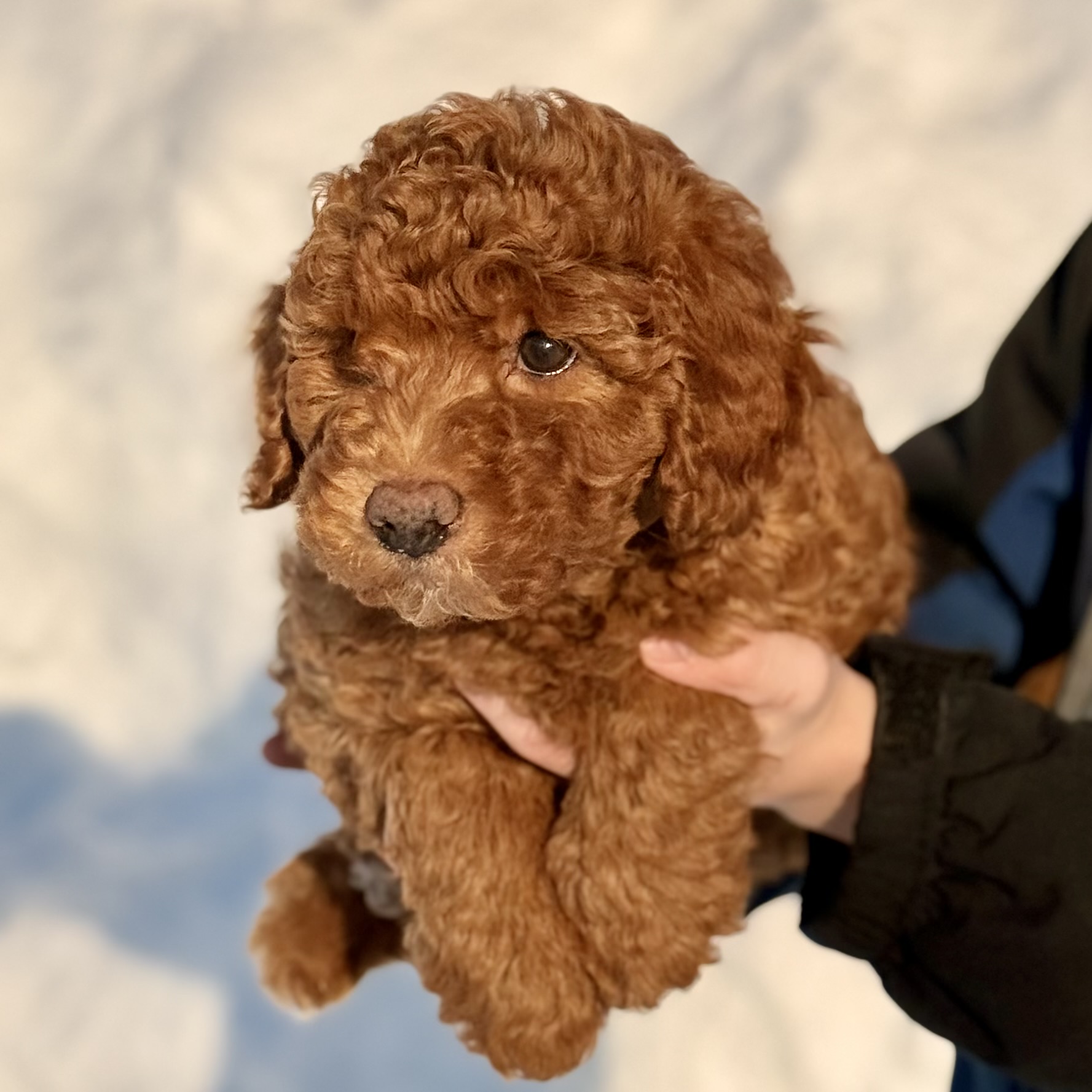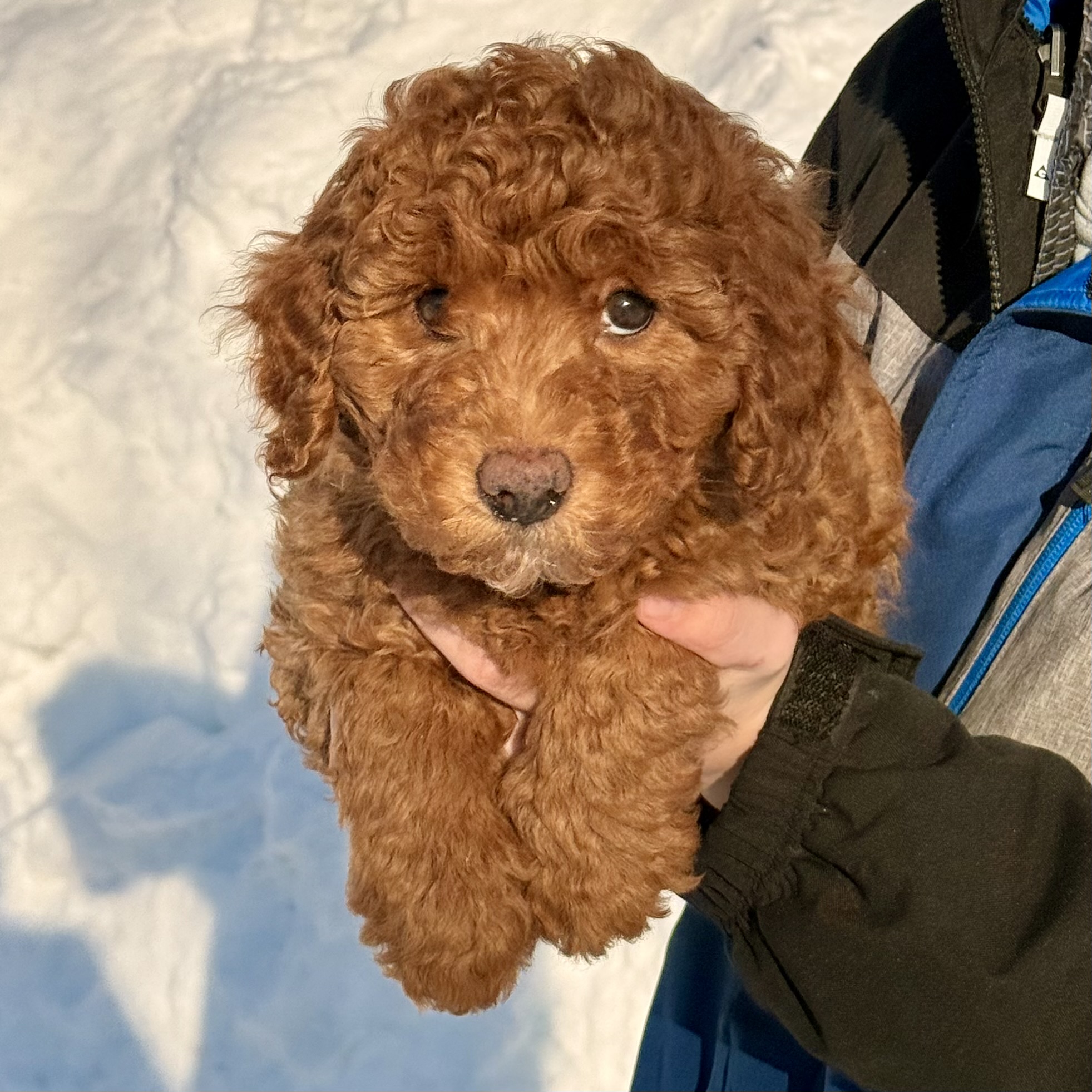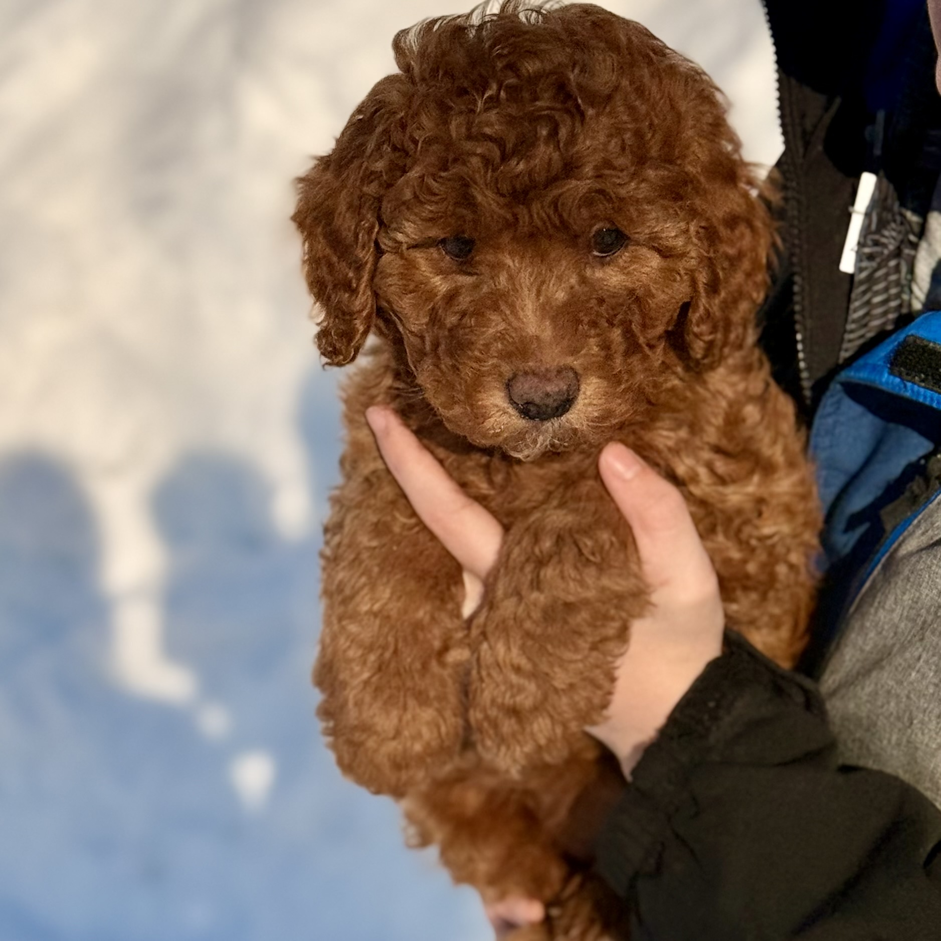 She is a gorgeous, golden color. She is expected to be 30-35 lbs fully grown. She is very soft and fluffy and she has been well socialized and raised in our home.