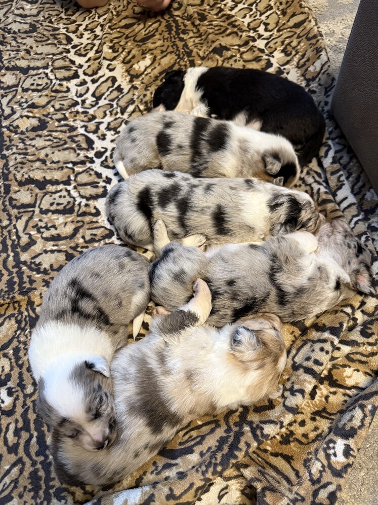 Aussie/Heeler. Christmas puppies!! We have 6 males and 2 females. Beautiful coats, some will have blue eyes. Very calm and healthy. Born 11/6/25 Dad is a CA pure red heeler, 26lbs, short hair. He is 11 yrs old. Mom is an AK pure red aussie, long hair/blue eyes, 8 yrs old. These are our family pets. I am not a breeder. Easy to train, they will herd your livestock, they are loyal and brave! Extemely smart! Adapt and read their owner well! Mama had an easy birth. Last litter was 4 yrs ago. Raised with kids, cats and chickens.