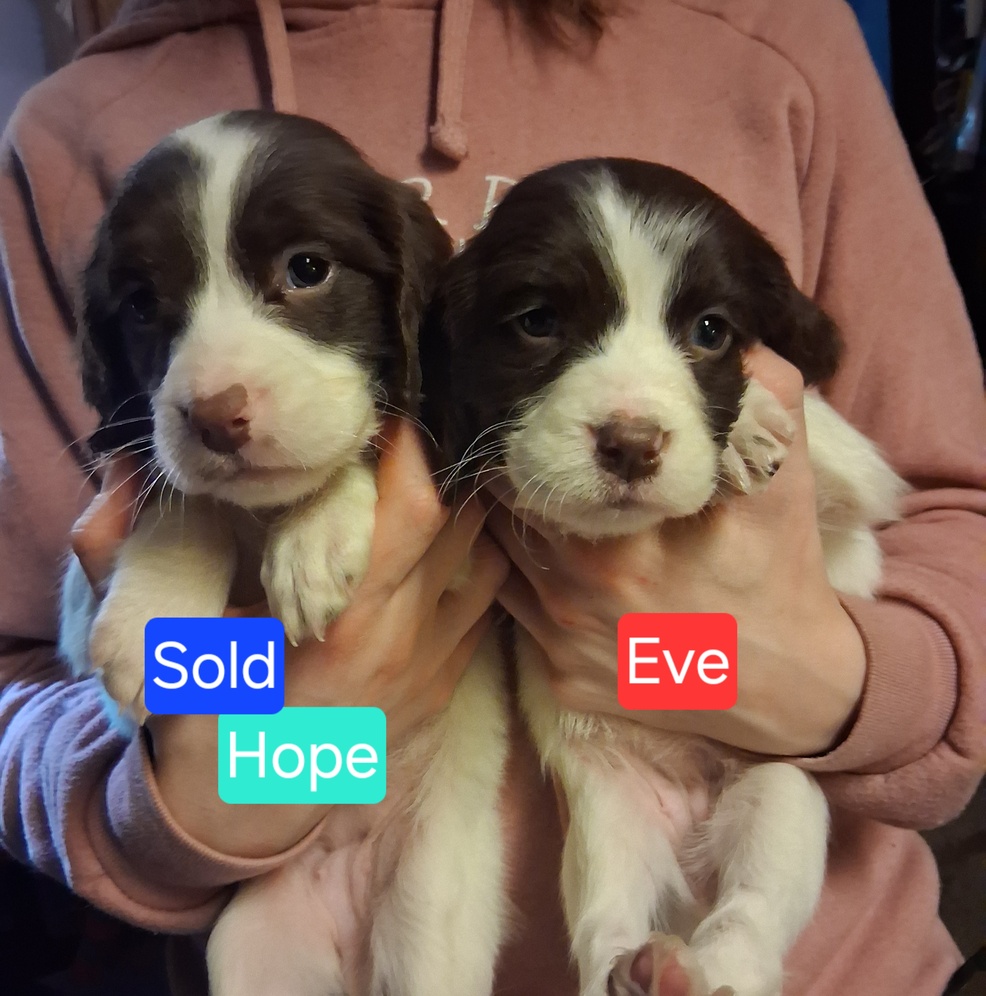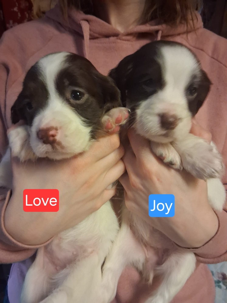 AKC English Springer Spaniel Puppies!!!! We only have 4 females available! Eve, Love, Joy, and Faith!!! Ready now! The dam and sire are AKC English Springer Spaniels! Both are sweet and smart! The mom walks with me off leash.They have great temperaments! The puppies come with dew claws done and tails docked. Come well socialized! Also come with a blanket and toy. And come with 1st shots. Come with AKC limited registration. English Springer Spaniels are eager to please aeasy to train! They are smart and attentive also obedient! So make great service dogs! Also are awesome family dogs! Great hiking buddies! And great companions! And can be great hunting companions! Tex for more pictures.