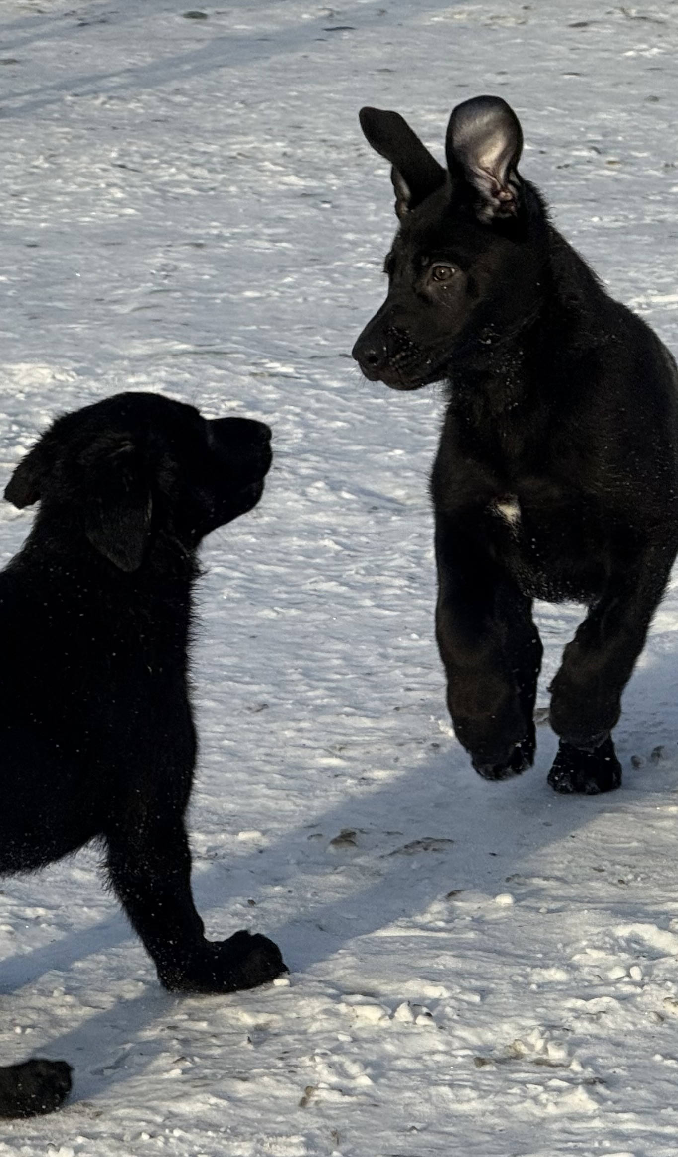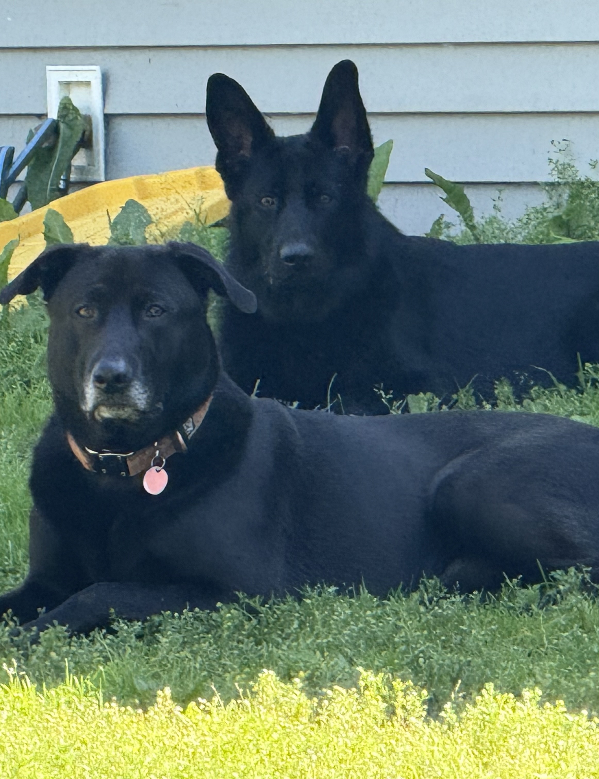 Two puppies left. 1 male, he has a dark brown and black brindle mix with a white patch on his chest. Blu, the female is solid black with ruffled hackles. Both pups were born on 6 September. They have been socialized, dewormed, and have completed their second set of DAPP/ vaccinations , and come with up to date records. These pups are fun, witty, quick learners who love running around with the kiddos, and are ready to join their new families and go to their forever homes. Both parents pictured below will be site. Mom is a full breed all black German shepherd, dad is half Dutch shepherd with Staffy and lab traits. Call or text for any additional information or pics. Thank you.,