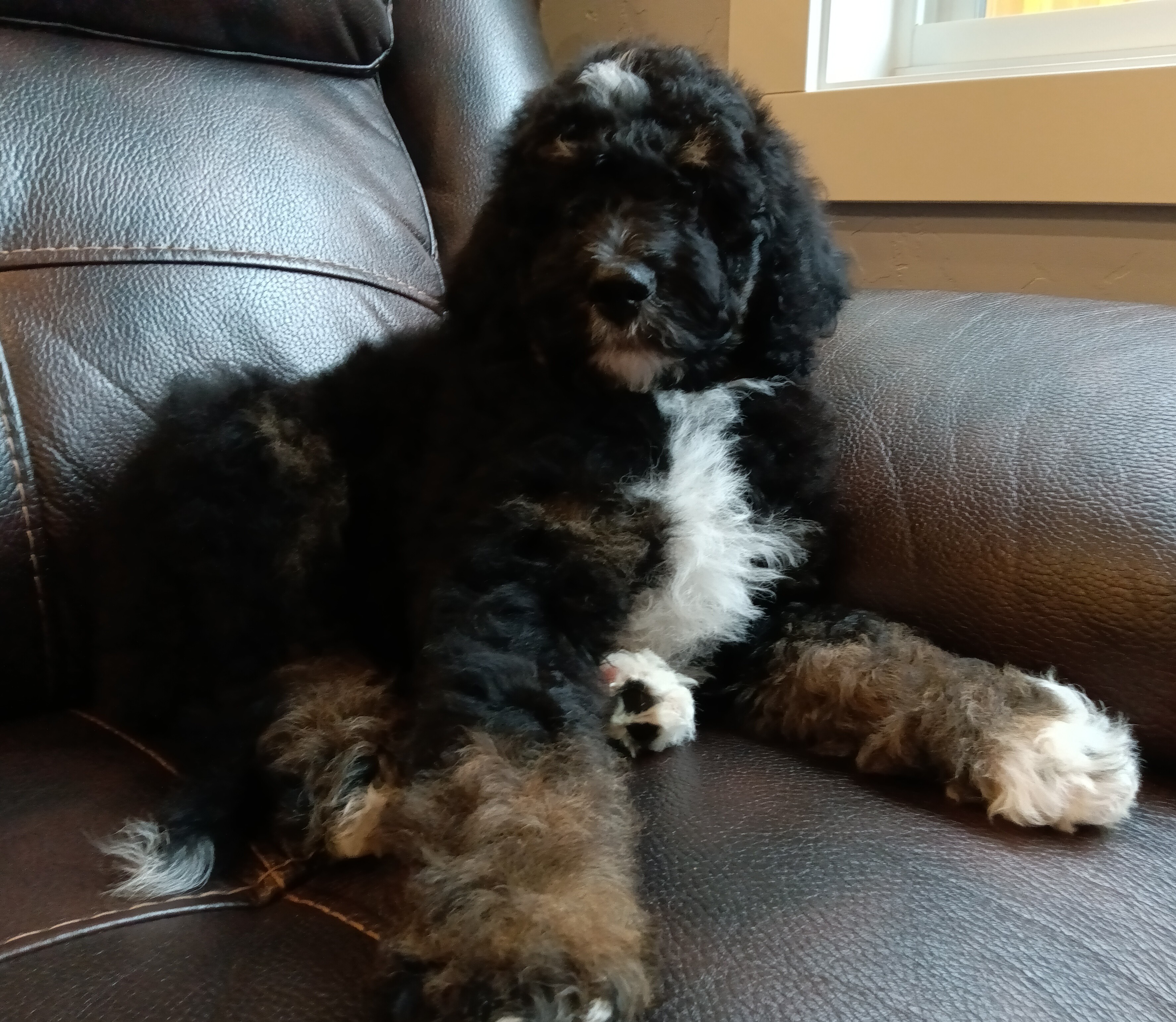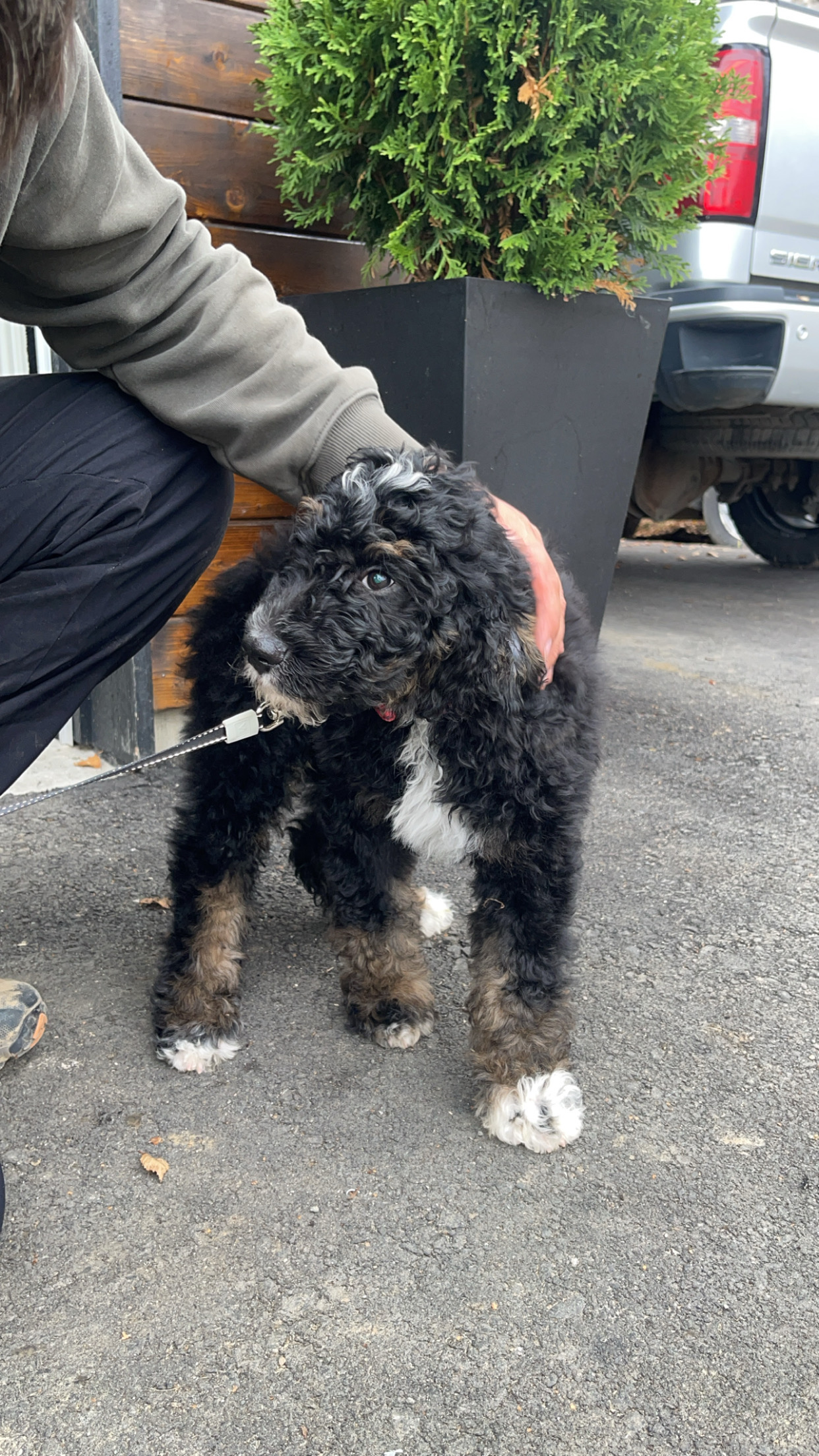 This gorgeous 5 month old boy is a black traditional tri-color with rich copper points on his cheeks, ears, eyebrows, legs, and under his tail—absolutely stunning markings. He has rear dew claws and a beautifully curly coat that is non-shedding and hypoallergenic, showing stronger poodle coat traits than the typical 50/50 Bernedoodle. His curls are soft, full, and ideal for families looking to minimize shedding and allergies.
