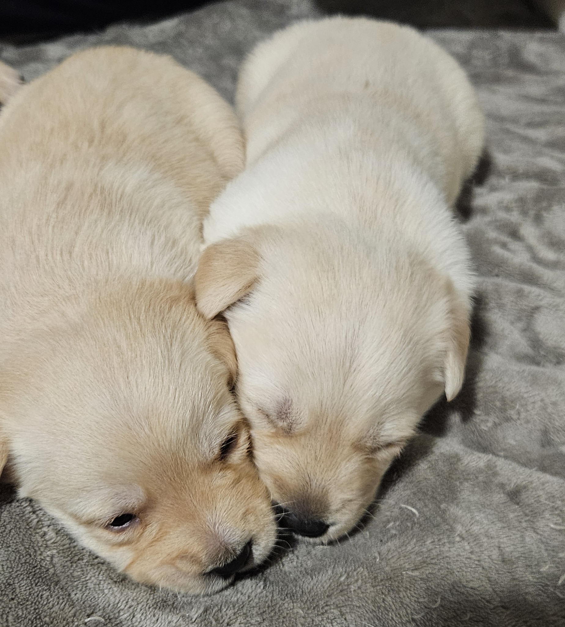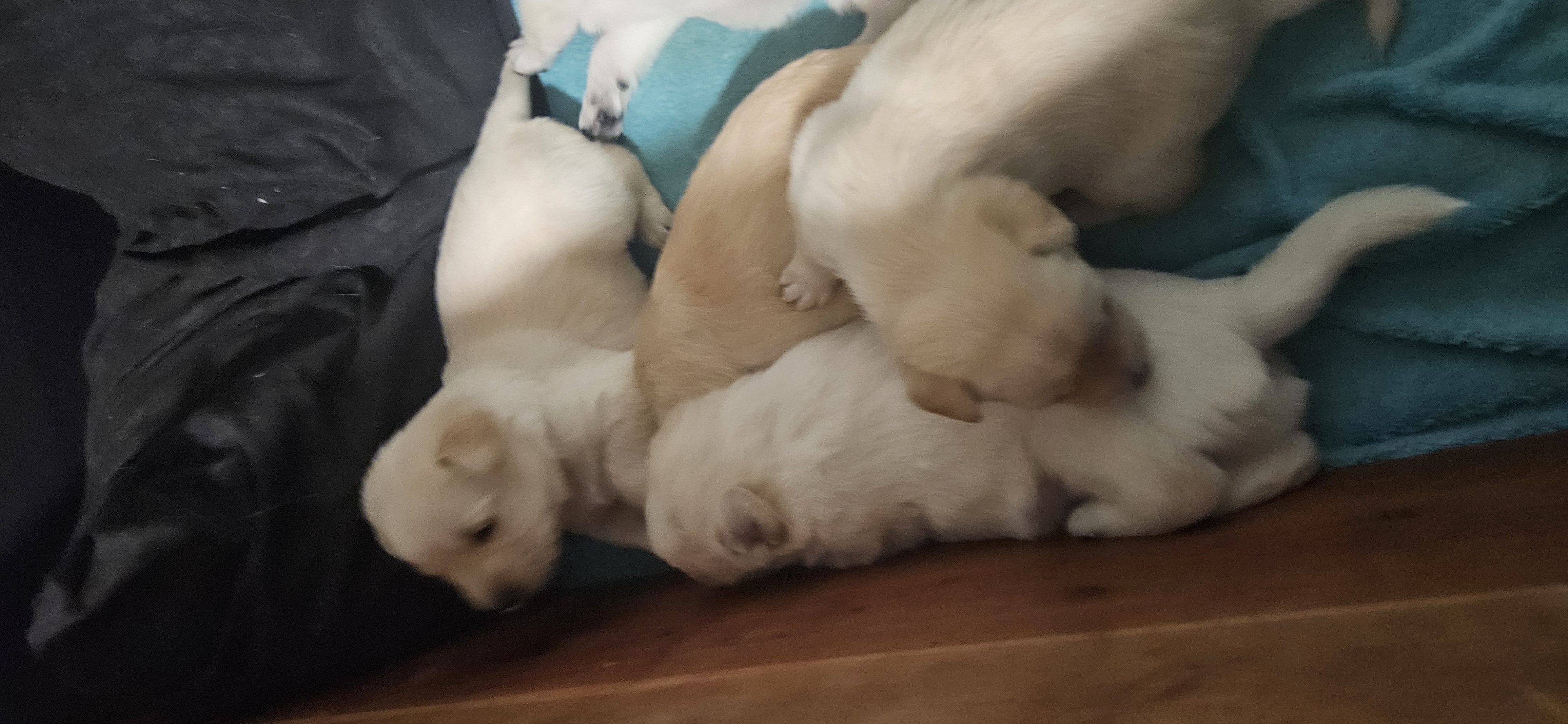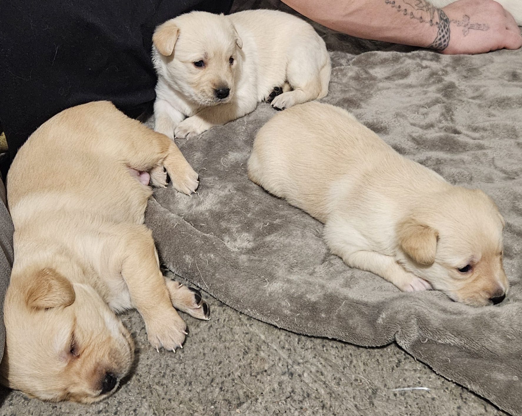 Puppy Love? These adorable babies will be 8 weeks old on Valentines Day. Born on Winter Solstice. Dad is yellow lab, mom is a smaller husky mix. Both parent's have good temperament. Puppies have been around other dogs, cats and children. Starting solids and dewormer this week. Depending on their progress, they should be available on Valentines Day. 3 males, 2 females.