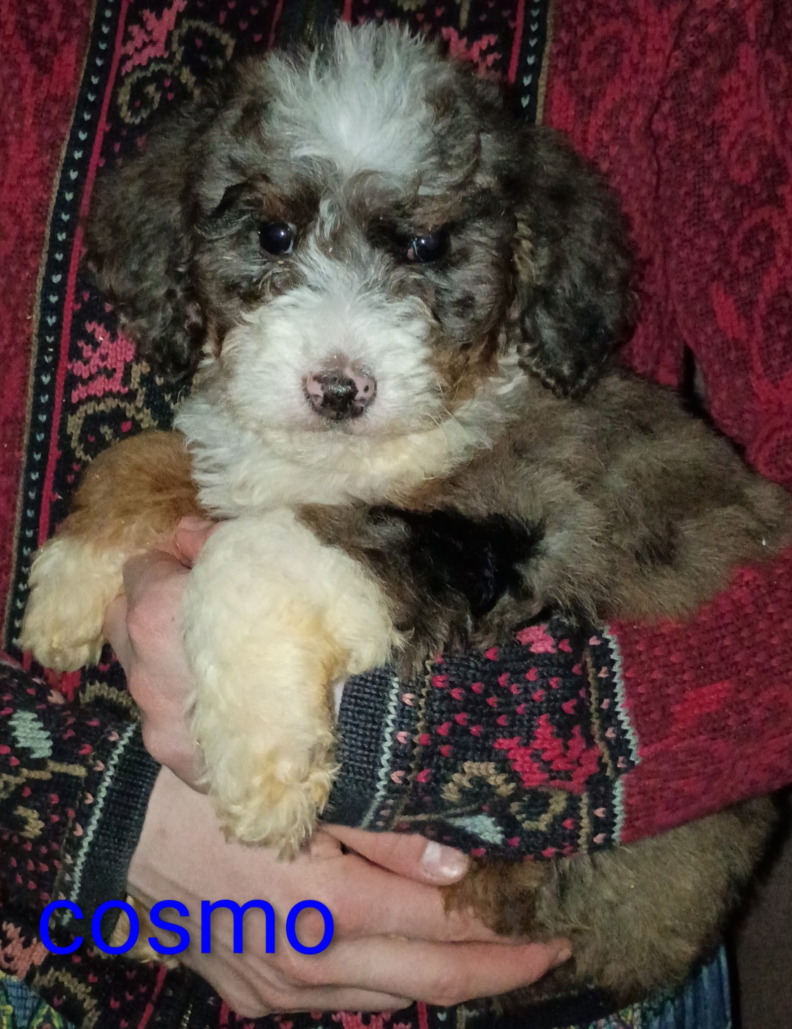 We have some puppies about 9 weeks old Dad is Bernese doodle and Mom is golden doodle= golden mountain doodle. The golden retriever in our female golden doodle lineage was a white golden retriever imported from Russia.These type of designer dogs are loving, loyal and intelligent. You can Google about this kind of breed mix if you want to learn more.They have their tails docked and had their first set of shots. These kind of dogs go for $1700 minimum. So our price is fair. Cosmo just became available. He and the other female are $1700. The male yellow puppies are $1600.