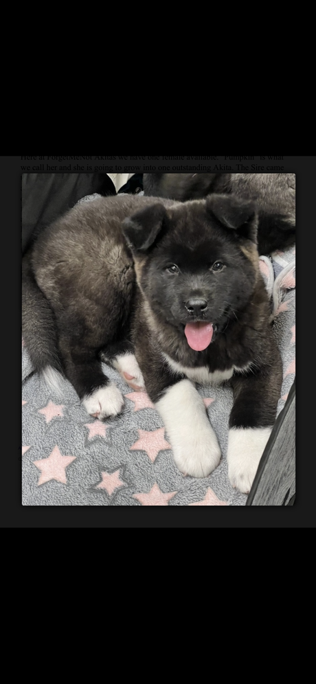Here at Forget-Me-Not Akitas we have 2 females and 1 male (long hair) available. These pups will mature into outstanding Akitas. Sire came to us all the way from Romania and has the best temperament you can ask for in an Akita. They are available now At 8 1/2 weeks old and have already been vet checked and microchipped. What’s included…. Best Friend and Protector for Life AKC Limited Registration (Pet Home Only) Vet Checked, Dewormed and Vaccinated Microchipped Introduction to the Crate Started on HouseBreaking LOTS Of Socialization Texting will get you a faster response Please do your research on this breed. This breed is not for everyone and is on the restricted list with some landlords and housing.