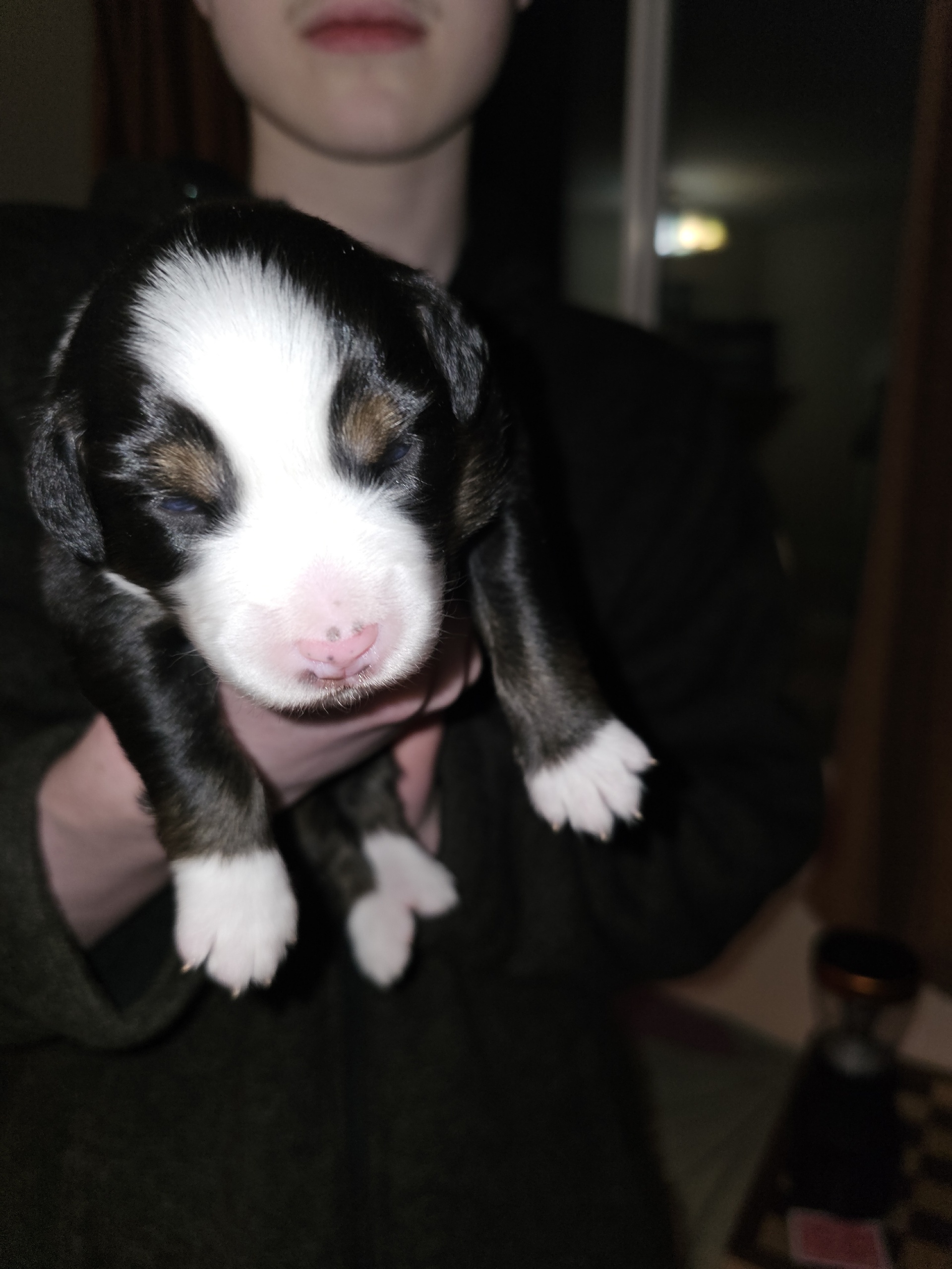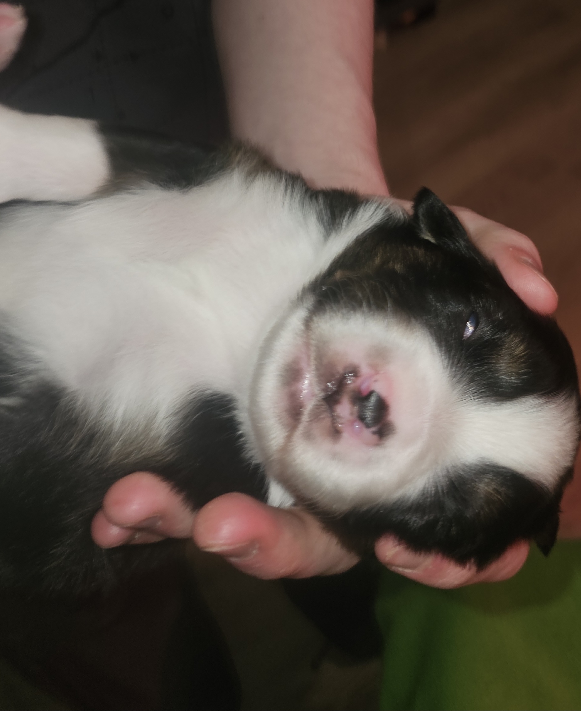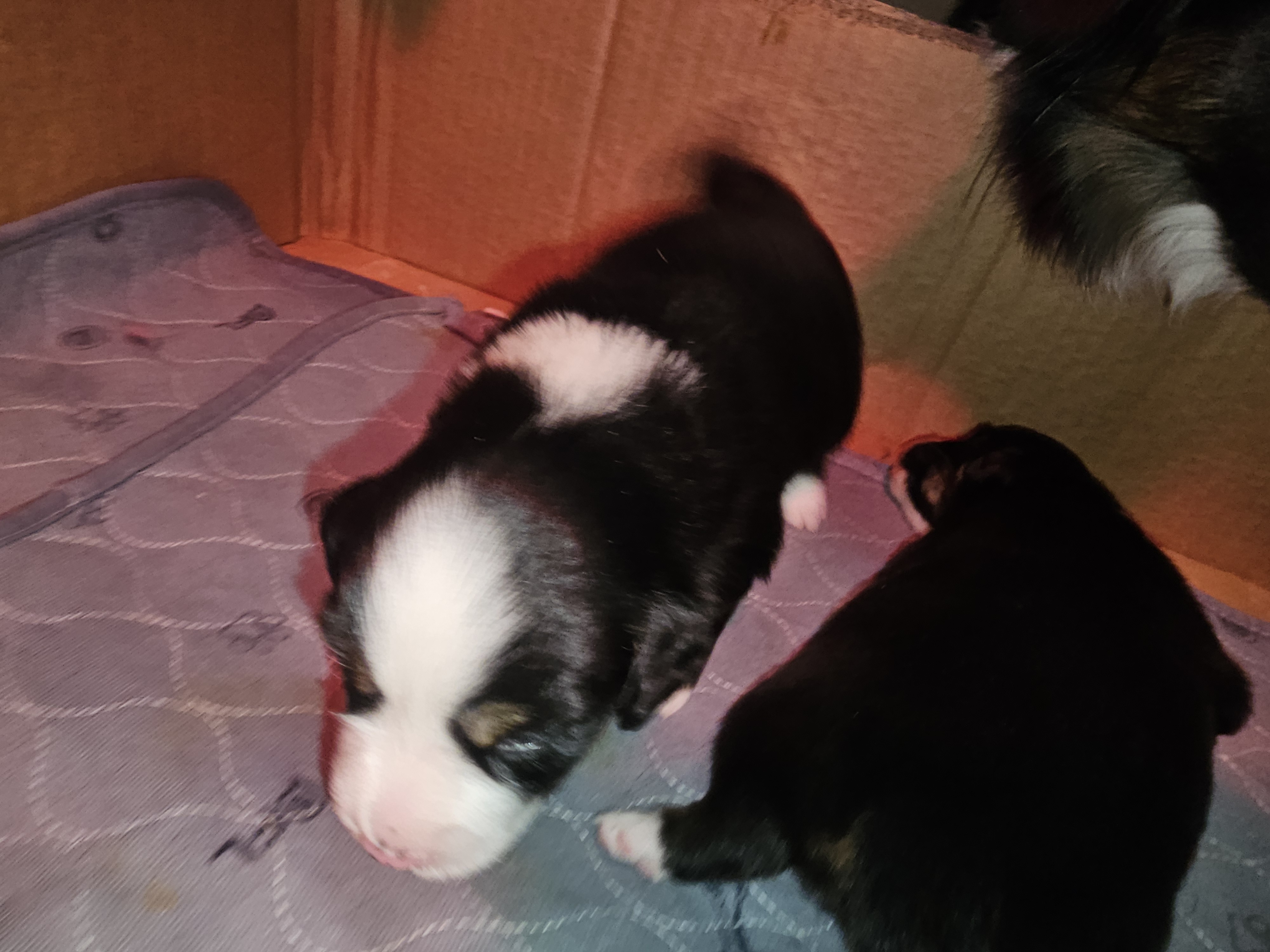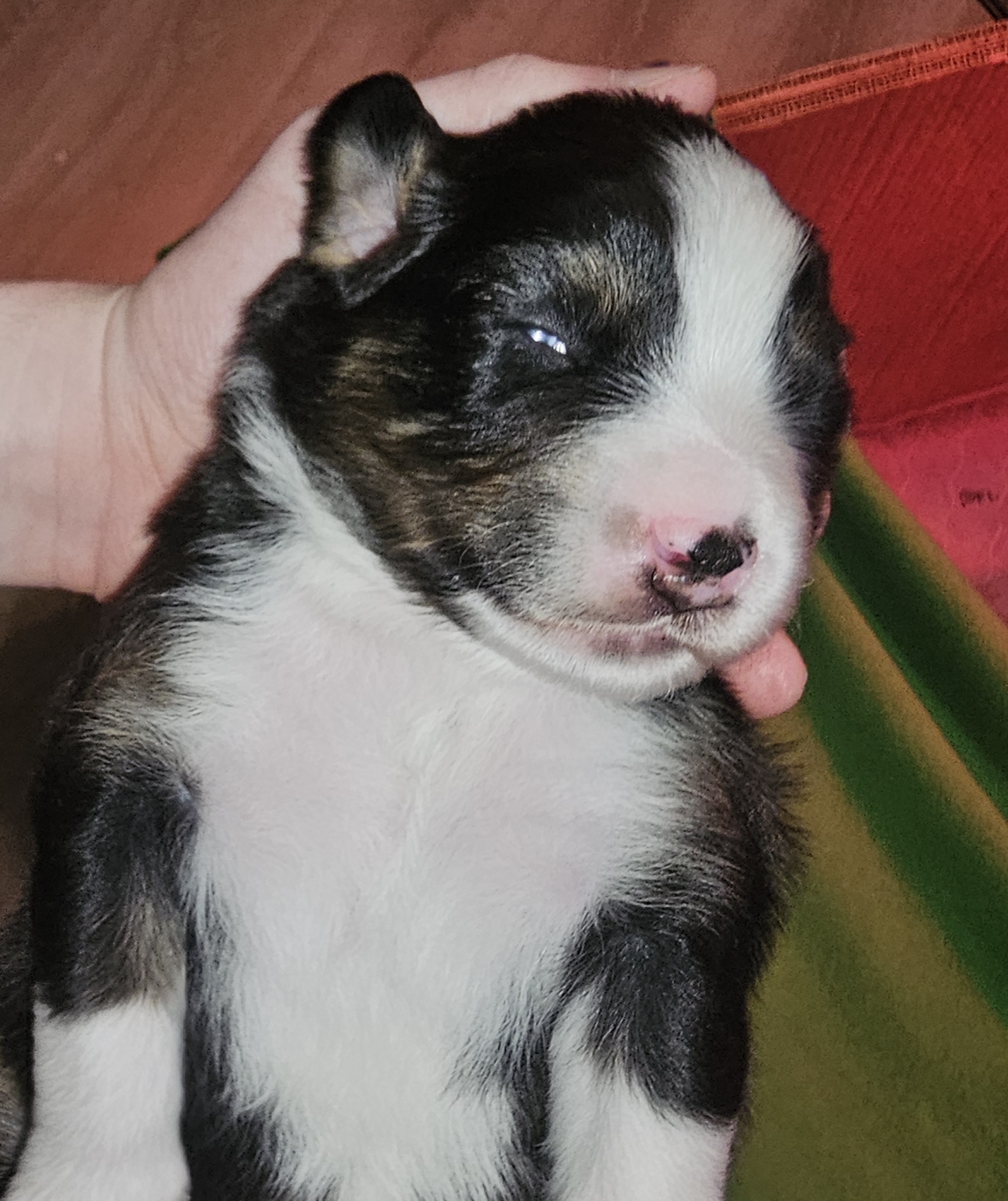 Miniature Australian Shepherd Puppies Born January 1. All black tri with beautiful markings. 2 females available. 1 male available. 1 male is spoken for. These puppies are AKC Miniature American Shepherds (the official AKC breed name for Miniature Australian Shepherds). Puppies are being raised in our home with kids, cats, and other dogs, so they’re well socialized and comfortable with everyday life. Parents are family dogs with excellent temperaments. Momma dog is very affectionate and loving, and dad is exceptionally smart — he gives “hugs” and was training in Search and Rescue. These pups come from an intelligent, people-focused line. Puppies will remain indoors due to winter weather and are raised in a clean, carefully managed environment. Tails are left intact as intended. Price: $1000 pet only $1400 with breeding rights. For those intesested I will be screening and only those that meet specific requirements will be allowed the option for breeding rights.