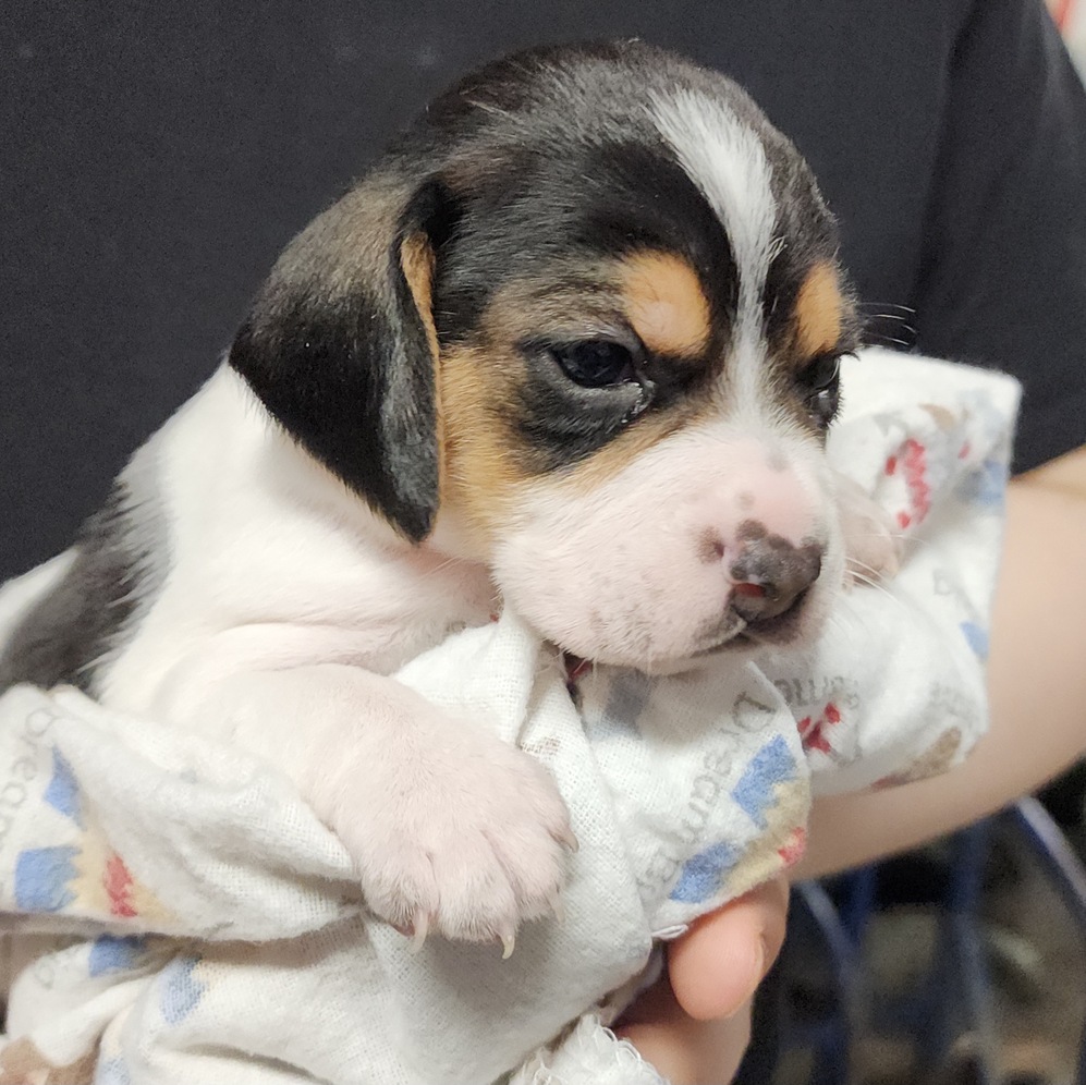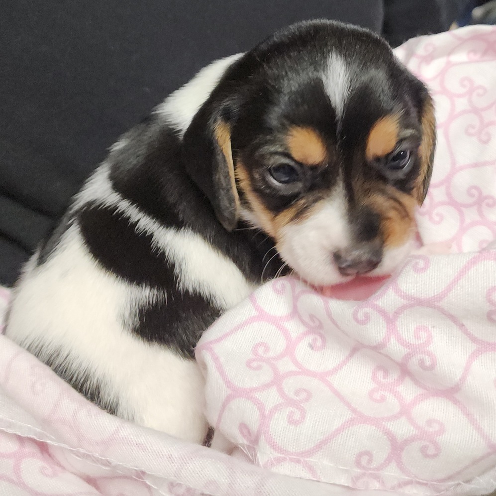 Born January 2nd, 2026, we have 5 available females and 2 available males. Suitable for an apartment or smaller living space, These puppies will stay under 11 inches tall, and be between 10lbs and 15lbs fully grown. Medium energy level. Great with children. These puppies never need haircuts, hair is too short to matt or tangle, so brushing is easy peasy. The only grooming requirements are that you trim their nails, and wipe out their ears. Baths are easily done in the kitchen sink. Fully papered and registered. Both adult beagles are available to me met, and petted, at an in-person puppy viewing. Transportation to Fairbanks may be possible for a small additional fee. Willing to meet up in Anchorage. We do not sell breeding rights. Please call or text for more information and pictures