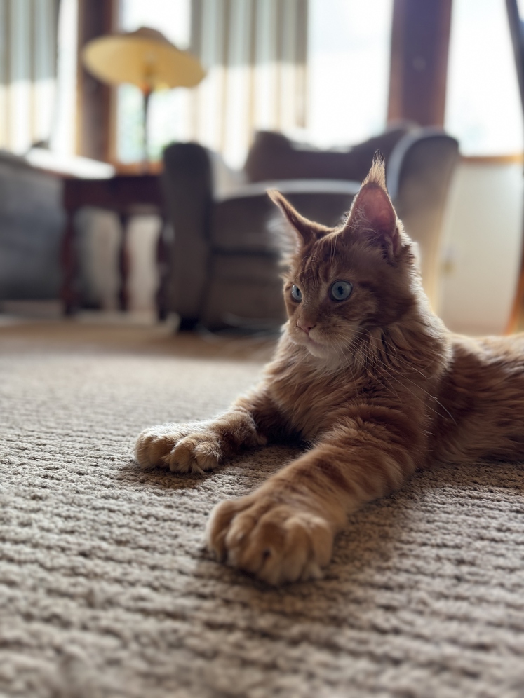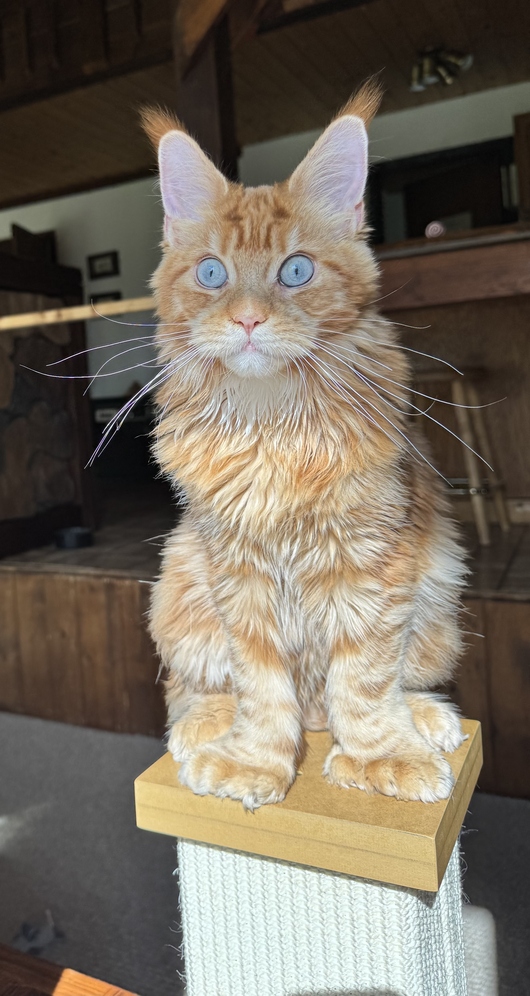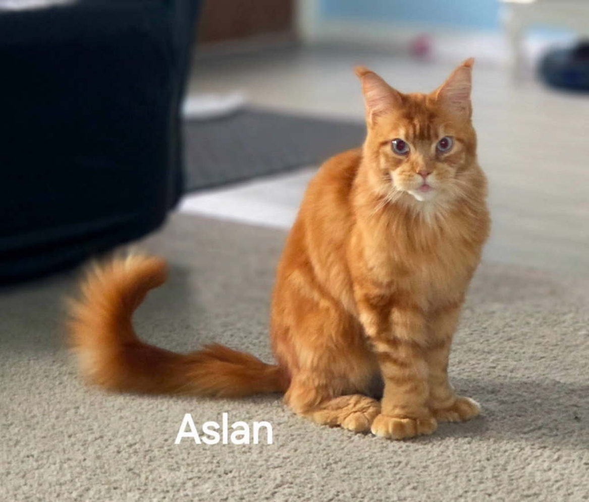This handsome boy is truly unique—it's rare to find a Maine Coon with his distinctive look. Originally from Canada, Aslan is currently 1 year and 2 months old and will continue to mature over the next few years.