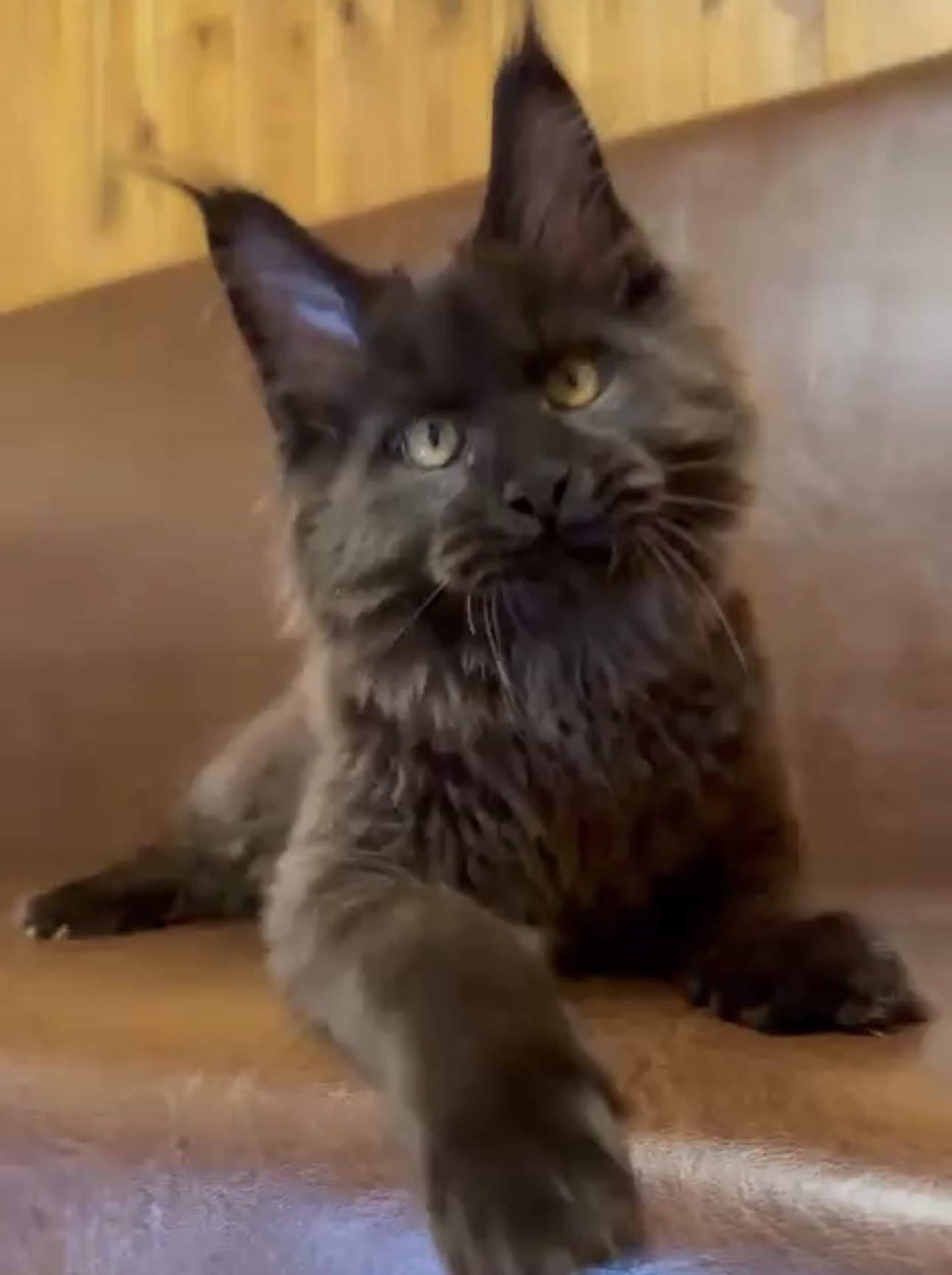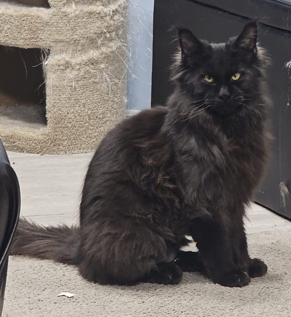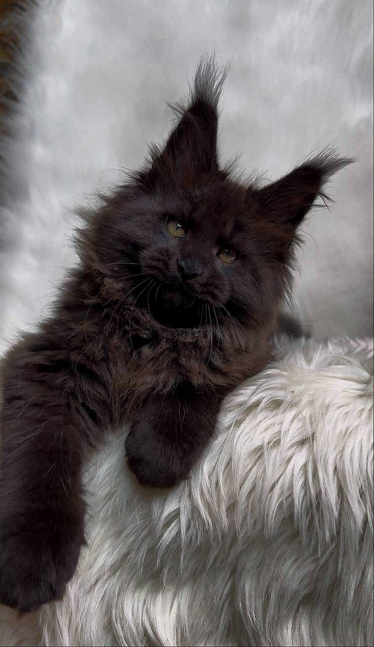 Meet Manolito (Mah-no-le-toe), a stunning Maine Coon kitten all the way from Moscow, Russia! Born on September 1st, 2025, this handsome boy is solid black with rich golden chocolate tonestruly something to behold. And just wait until you see his tail as he grows its going to be magnificent.