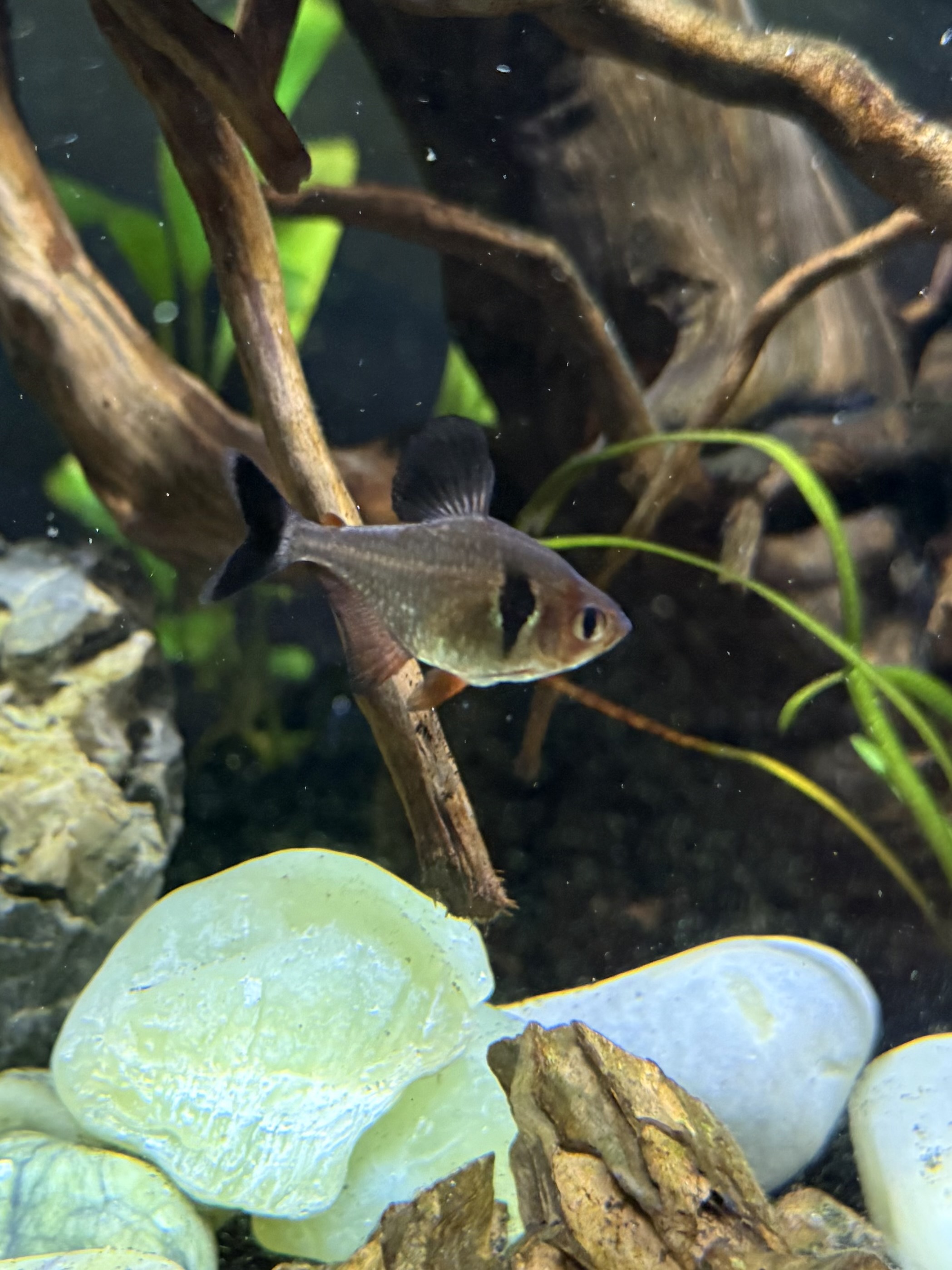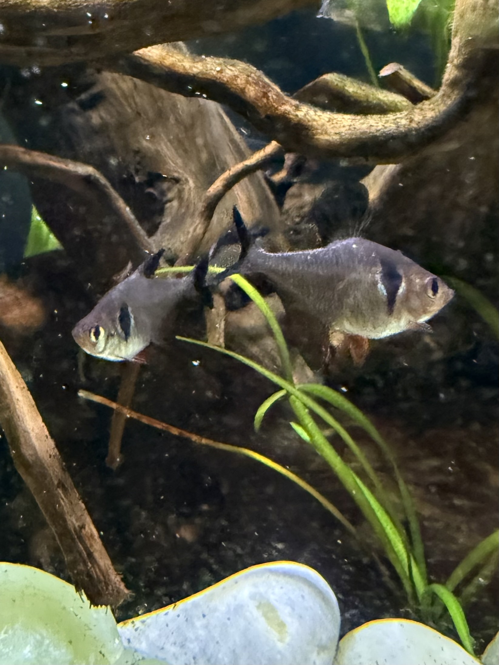 3 beautiful, healthy, active platinum tetras in a community tank. They are peaceful, and get along great with their tank mates. Tetras are schooling fish and should stay together.