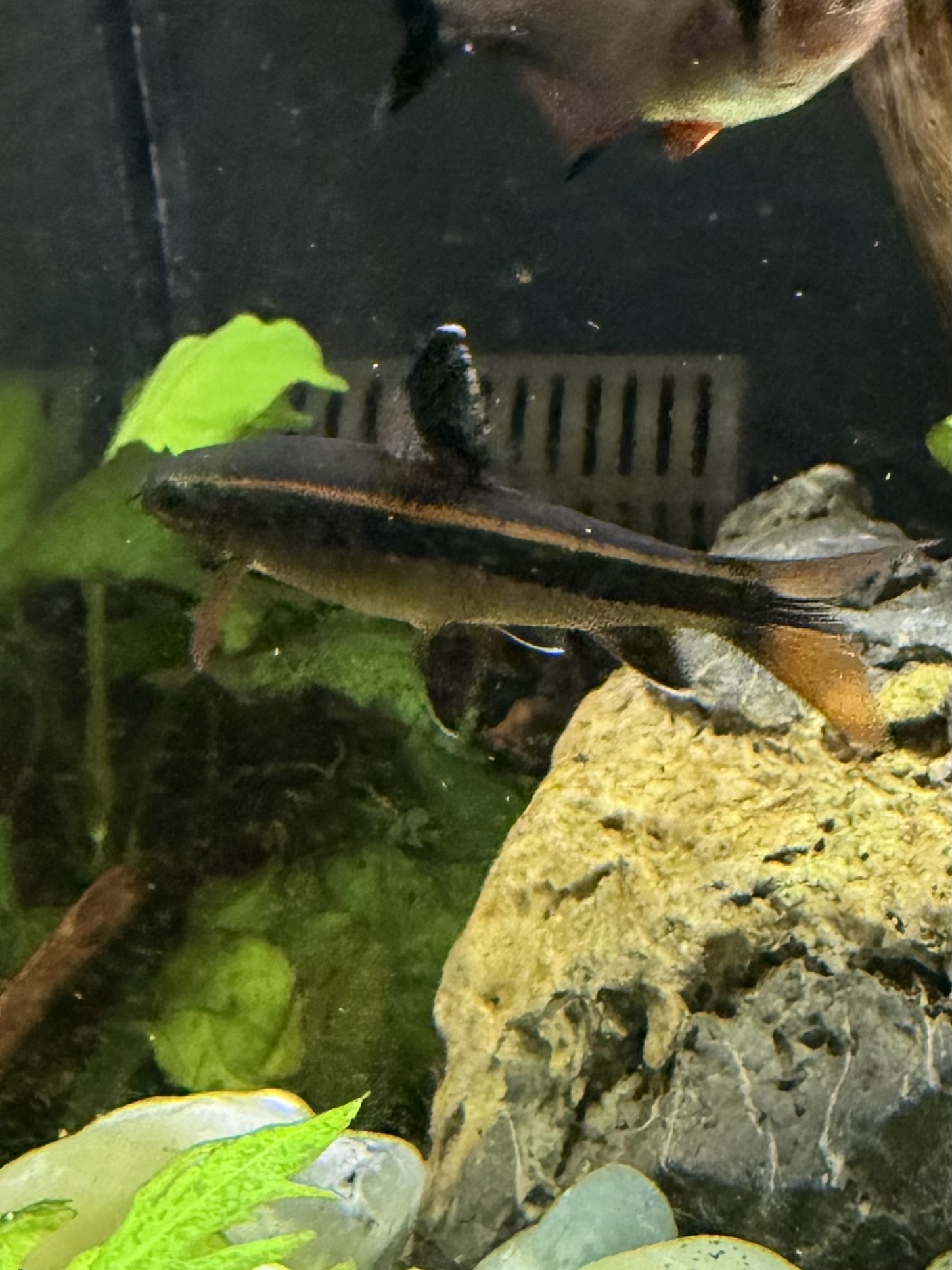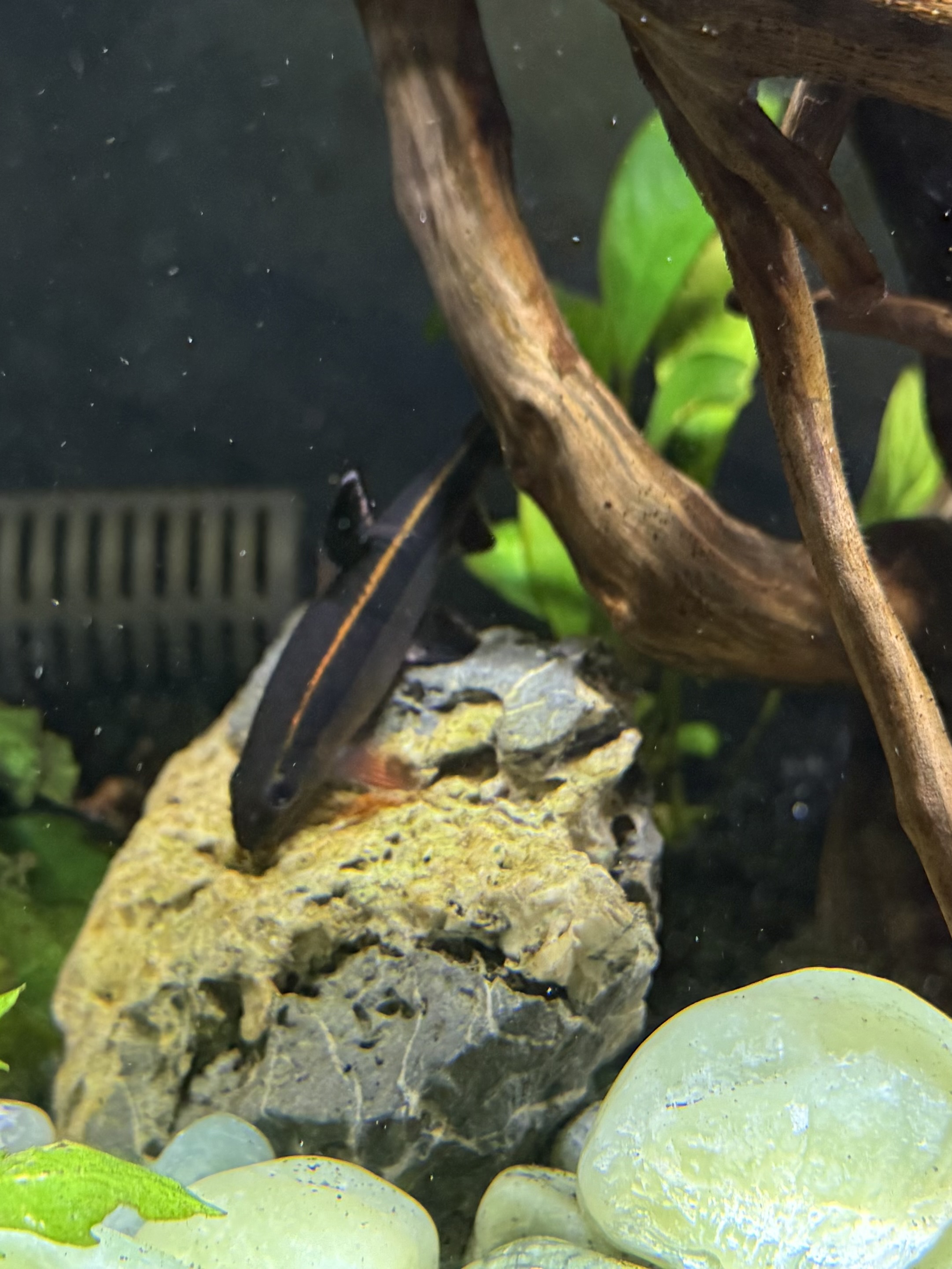 Mature flying fox about 3 1/2 inches long. Currently in a community tank with Gourami and Tetras, and gets along peacefully with everyone. He does have a tendency to get a little pushy with some fish that are small and too