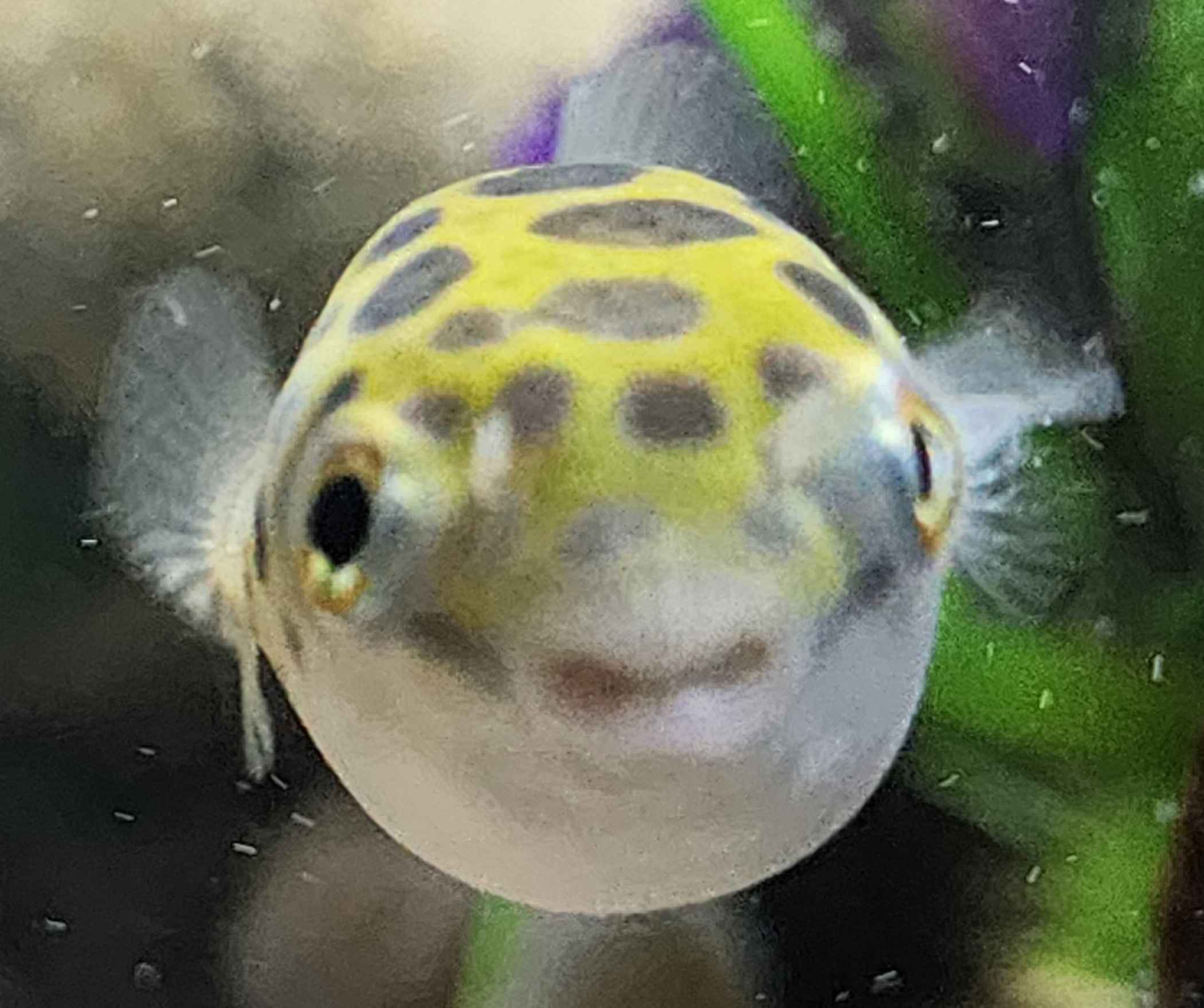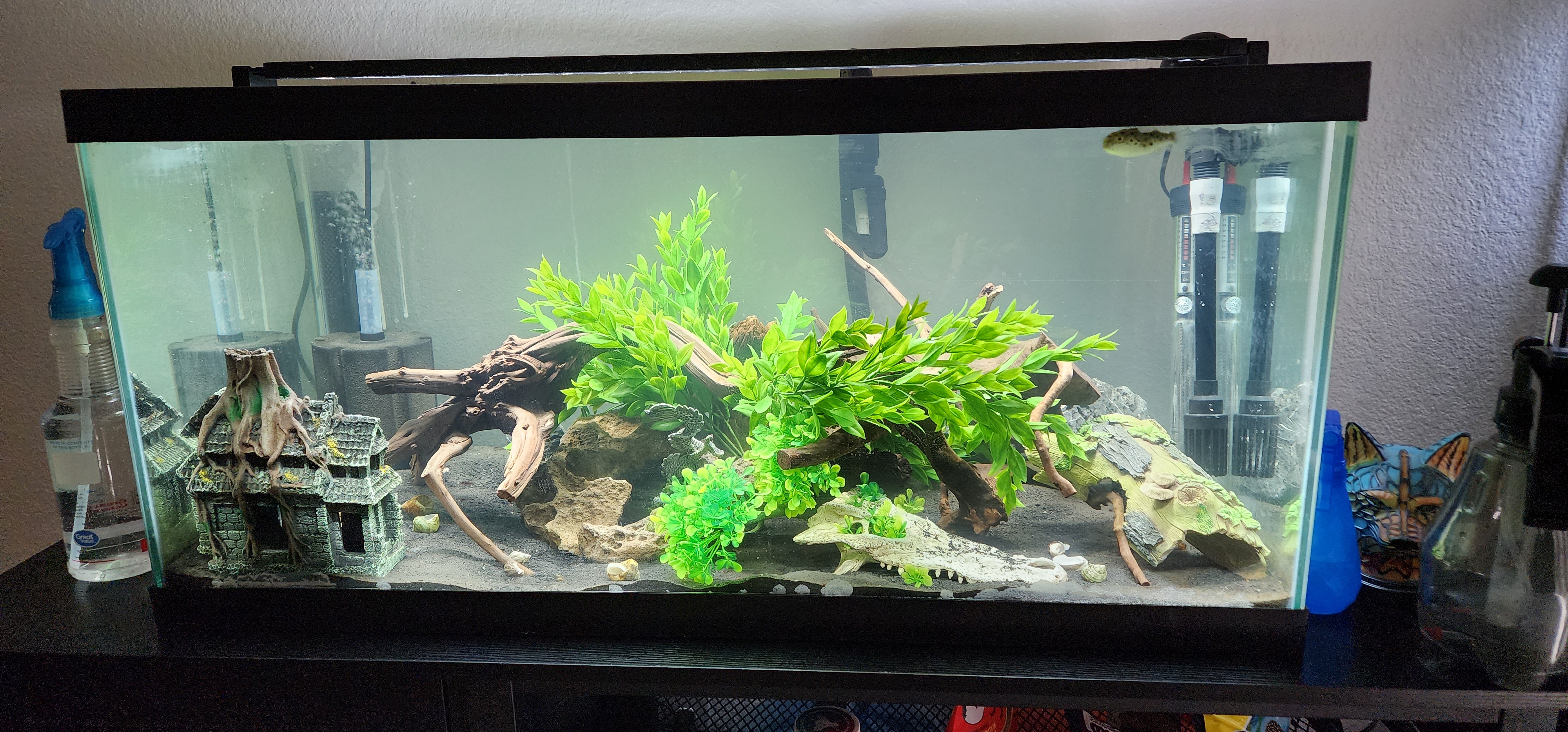 I need this little guy to go to a amazing home that will be his forever home. He is a couple of years old. I've had him since 2024 July. He is about 3 inches long, belongs in a brackish tank, at least 30 gallons, and should be housed by himself or with mollies. He comes with tons of food. I have a 40 gallon an entire setup, decorstions, air pump, giant filter, table along with an expensive filter so if you wanted to take everything the added price would be roughly $300-400 but for him its just $50 I have not had time to clean the algae and everything and the breakout has been insane.. I just need him to go to a home that will keep up with it (the clean picture was how it used to look like and now its just bad)