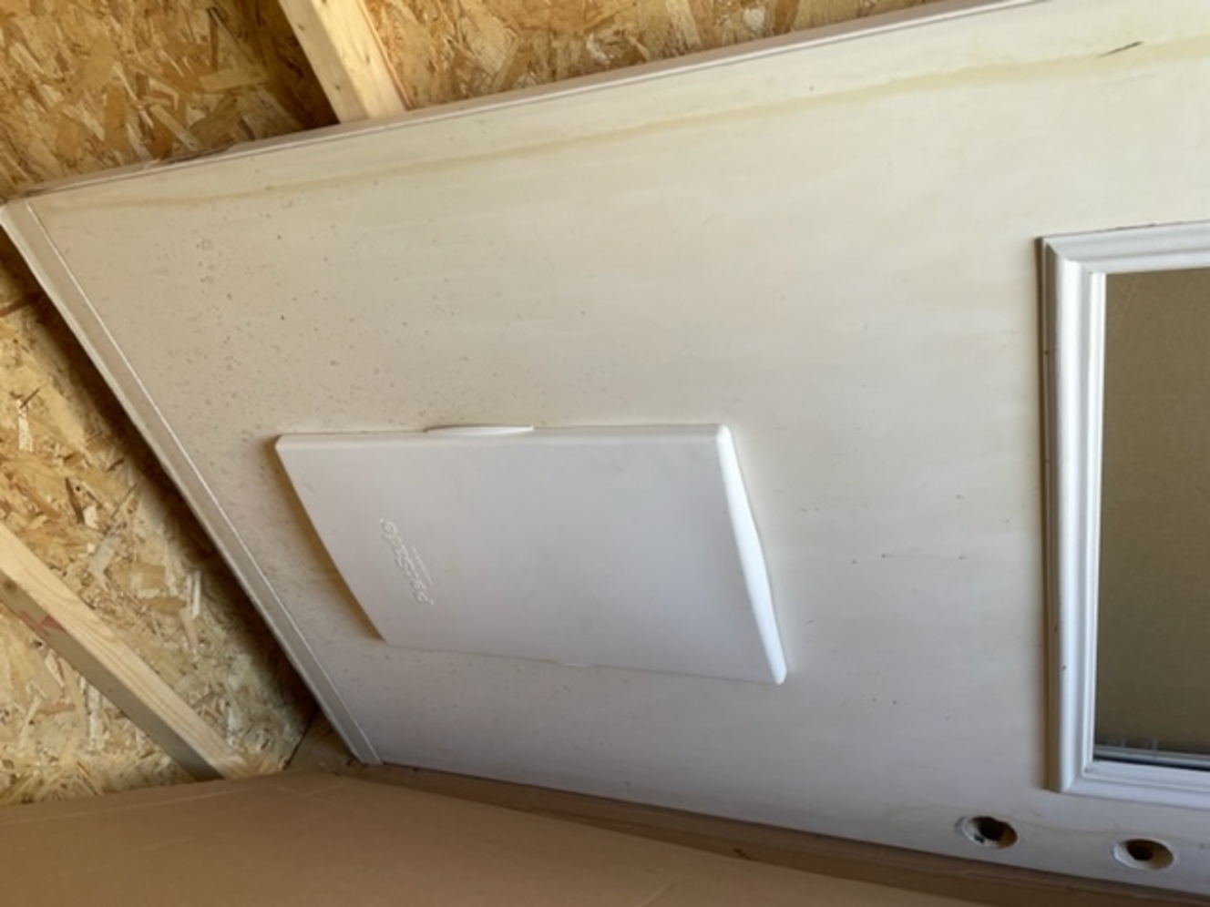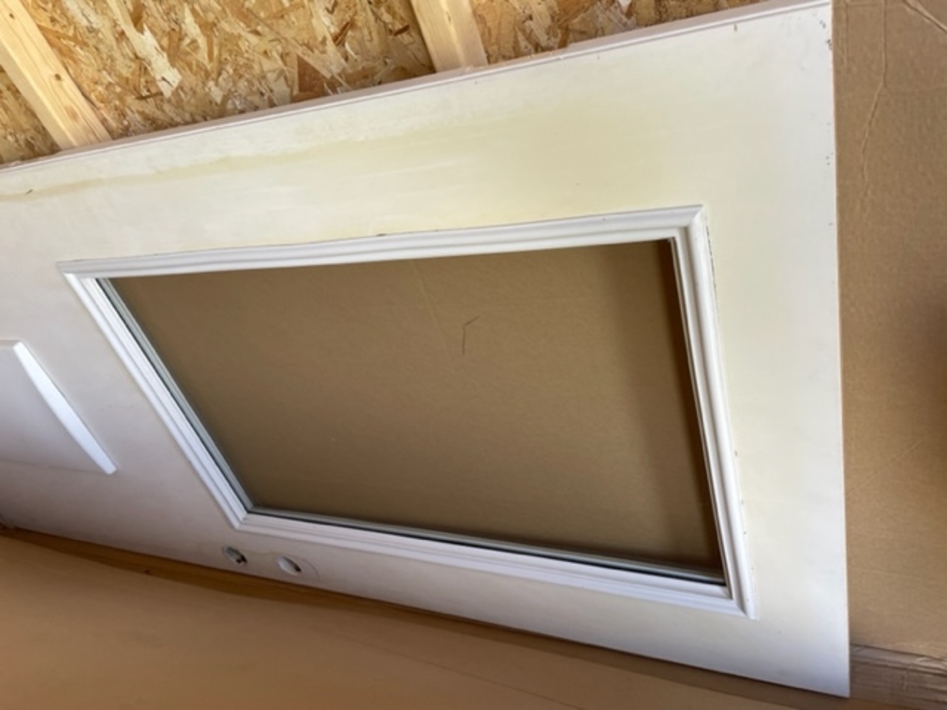 Solid smooth finish exterior house door 36"x79 1/2" with installed dog door - Pet Safe 10"x16" Door has glass at top - 24"x38" Right hand swing