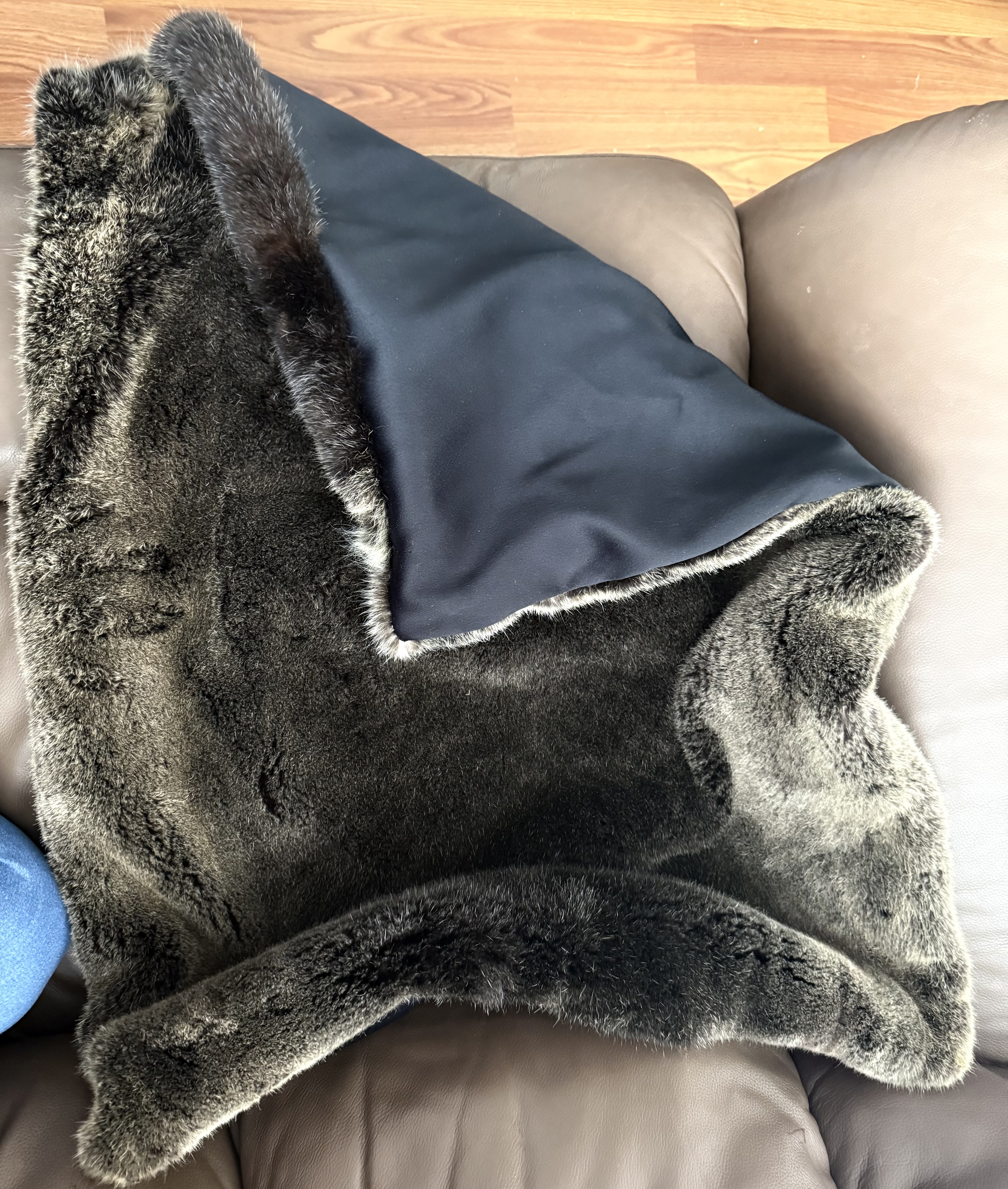 New. beautiful. and hand sewn lap blanket. Measurement is roughly 24"x32." Lined with black satin. Sea otter is dark with some gray fur. and soft as ever. It's a heavier blanket. but completely warm and cozy. Quyana!