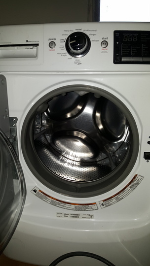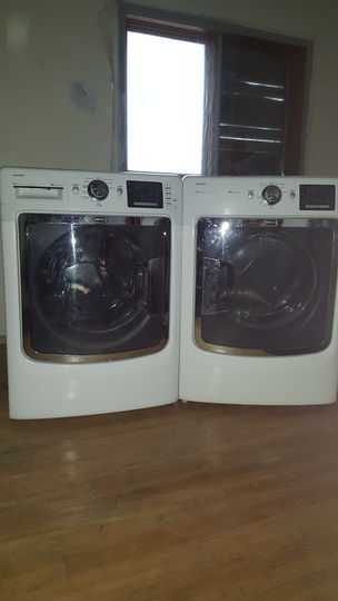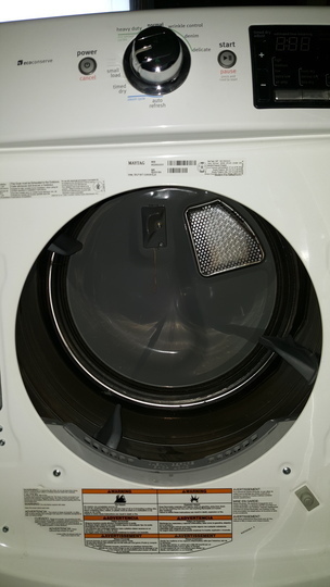 Like New White Maytag Maxima High Efficiency Large Capacity Front Load Stackable Washer and Dryer Set Washer is electric and has an internal heater making it efficient and improves cleaning. Features also include vibration control, delay start and sanitize cycle. All original hoses are included. Dryer is gas with a 120 plug and features advanced moisture control and steam cycle. All original hoses and hook ups included