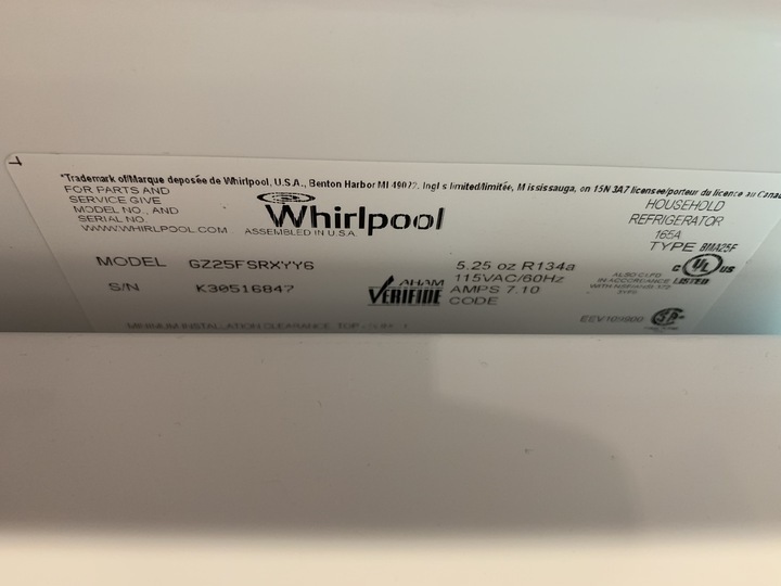 2013 Whirlpool French Door Refrigerator Stainless Steel 25 Cubic Feet Model GZ25FSRXYY only issue is cracked plastic as seen in photo.