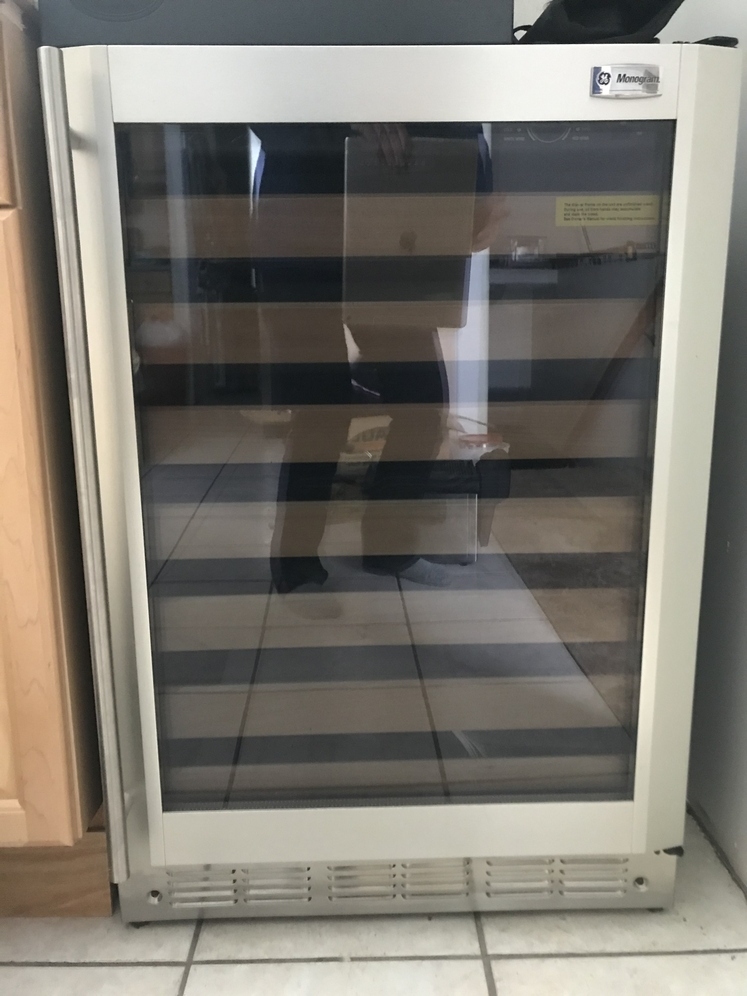 ZDWC240NBS GE monogram stainless steel wine chiller. NEVER BEEN USED! Adjustable temperature control, seven full width slide out racks interior light, see-through glass door, stainless steel, tubular handle, built-in, or freestanding installation options. For more information text Susan.