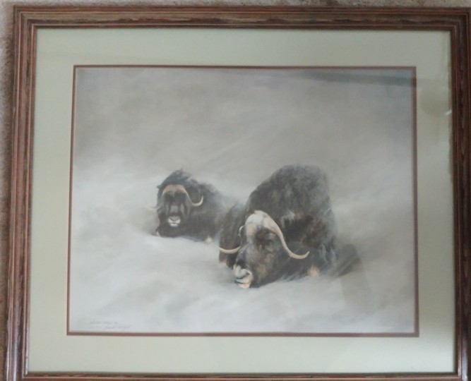 Musk Ox pair huddled in a snowstorm. Annette Hartzell print, framed in wood with two mats. 30" W x 25" H