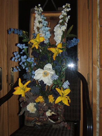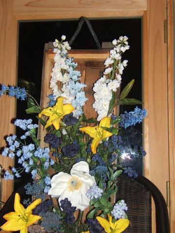 New blue and silk flower arrangement in a large, aged ammo box. This arrangement is 3 ft. X 1 ft.