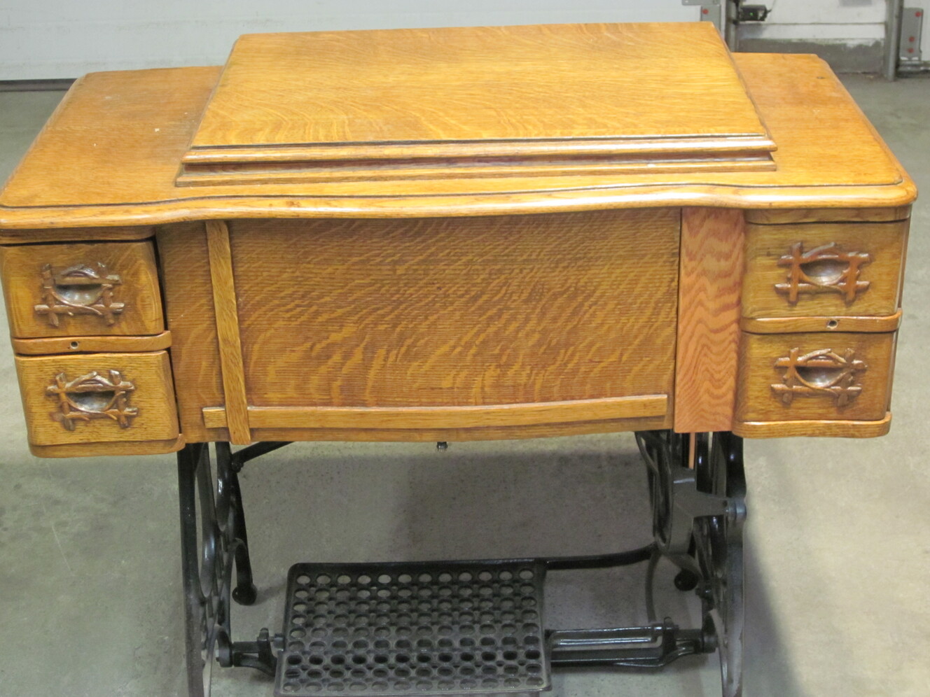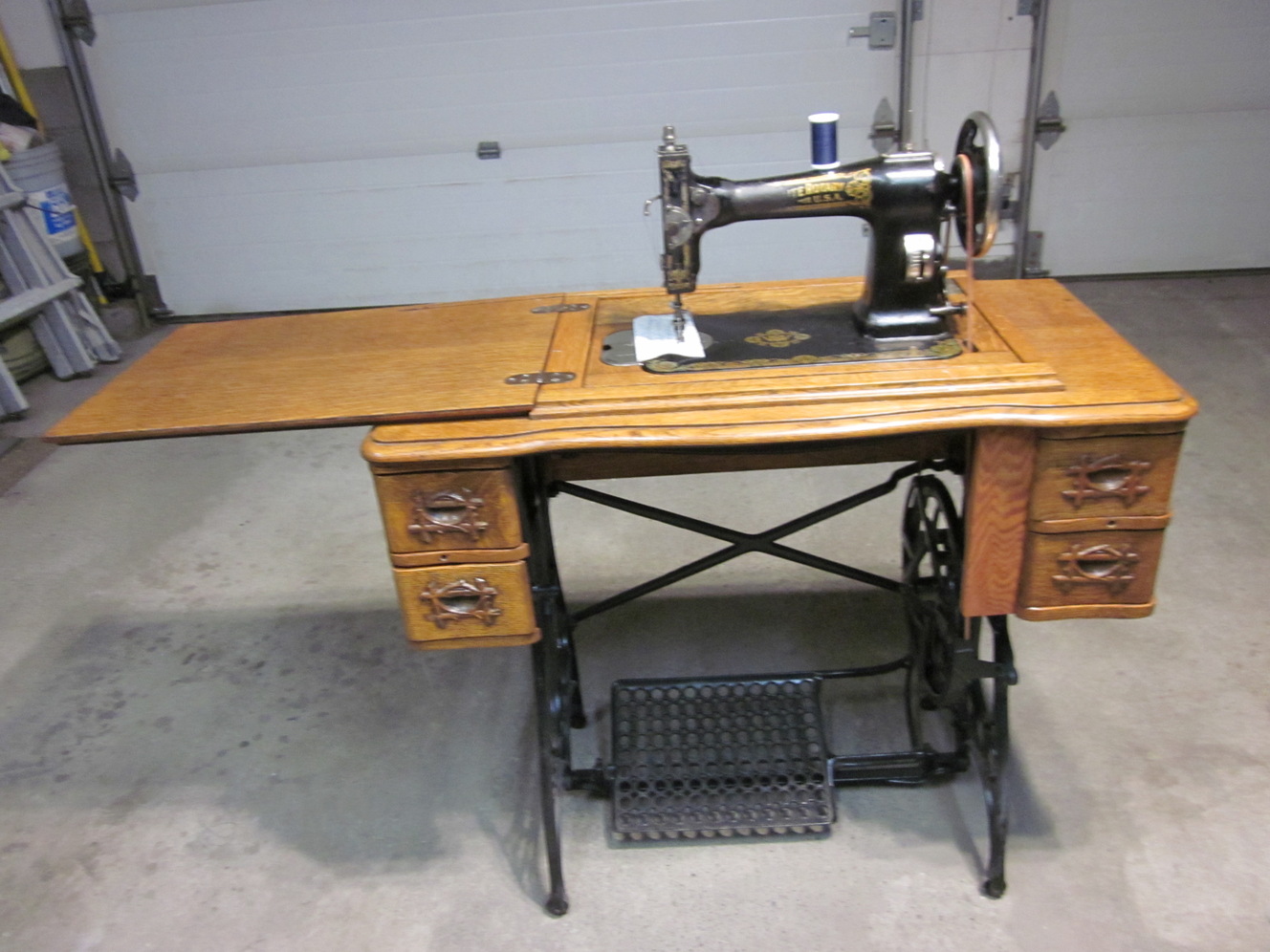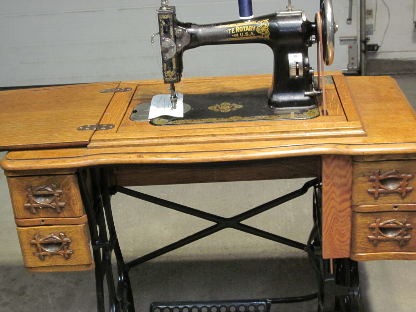 White Treadle Sewing Machine. Good condition, sews great. Includes machine head, cabinet, extra bobbin and instruction manuals.
