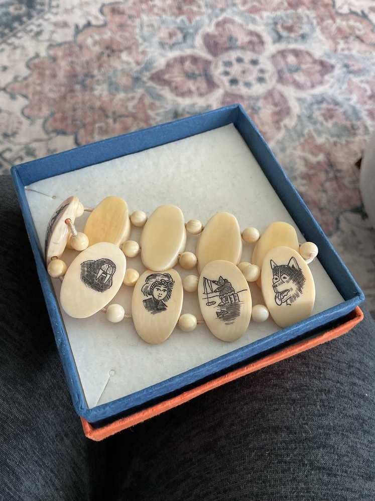 Ivory bracelet with Scrimshaw etched in. About a size 7” woman’s size Serious inquires only!