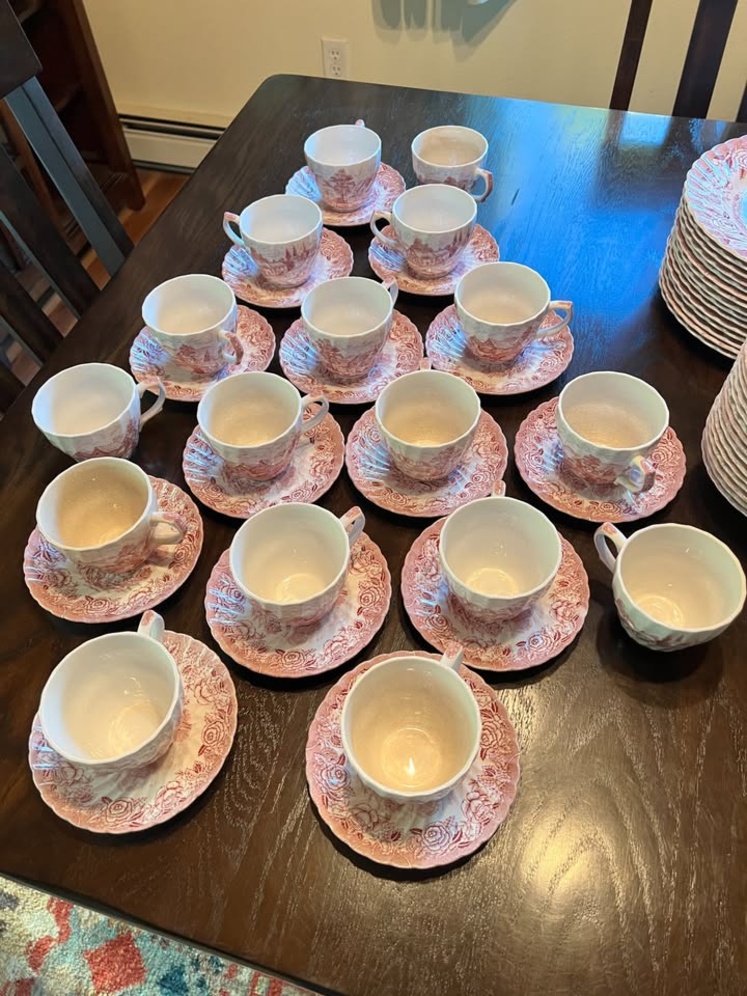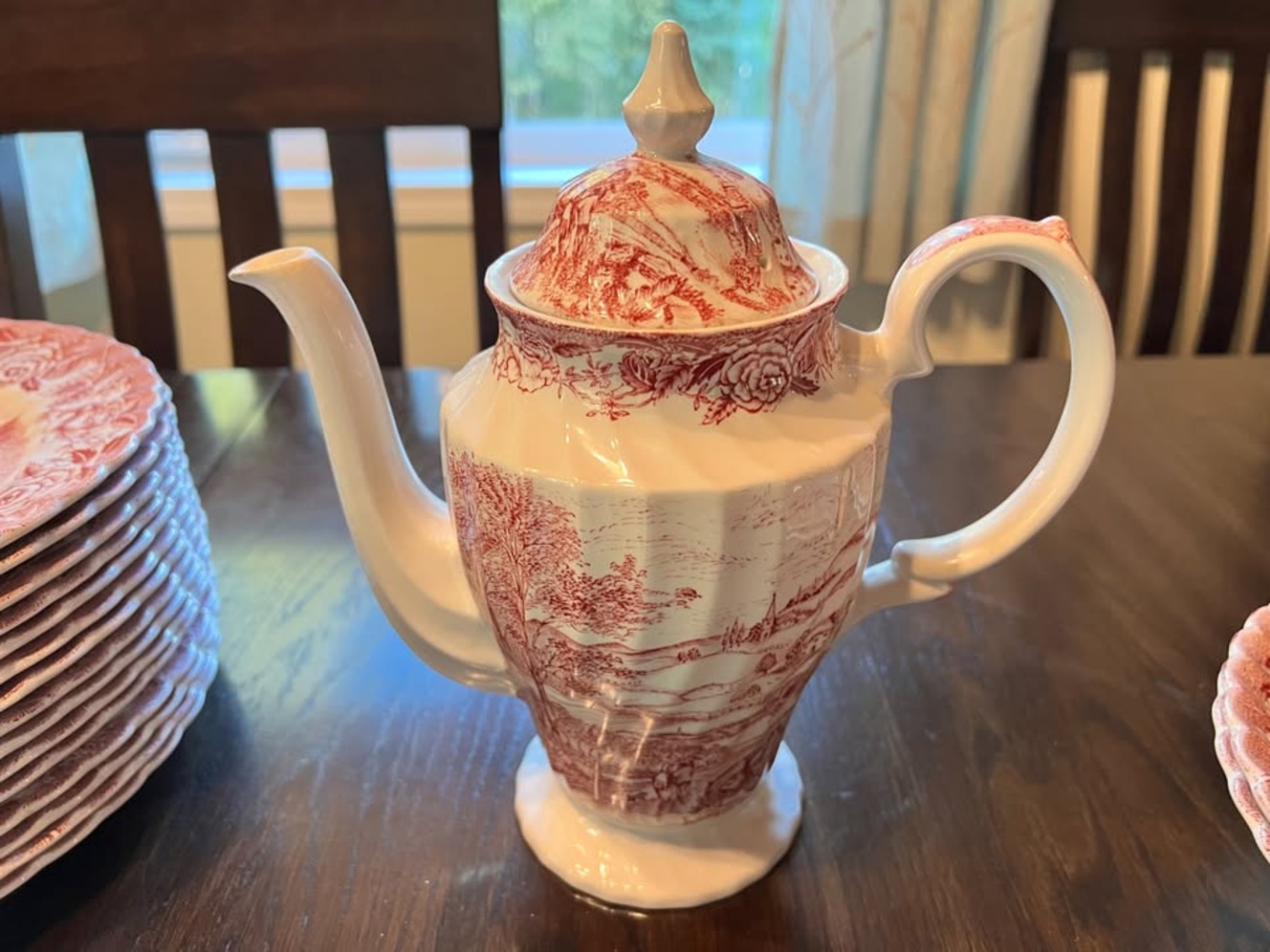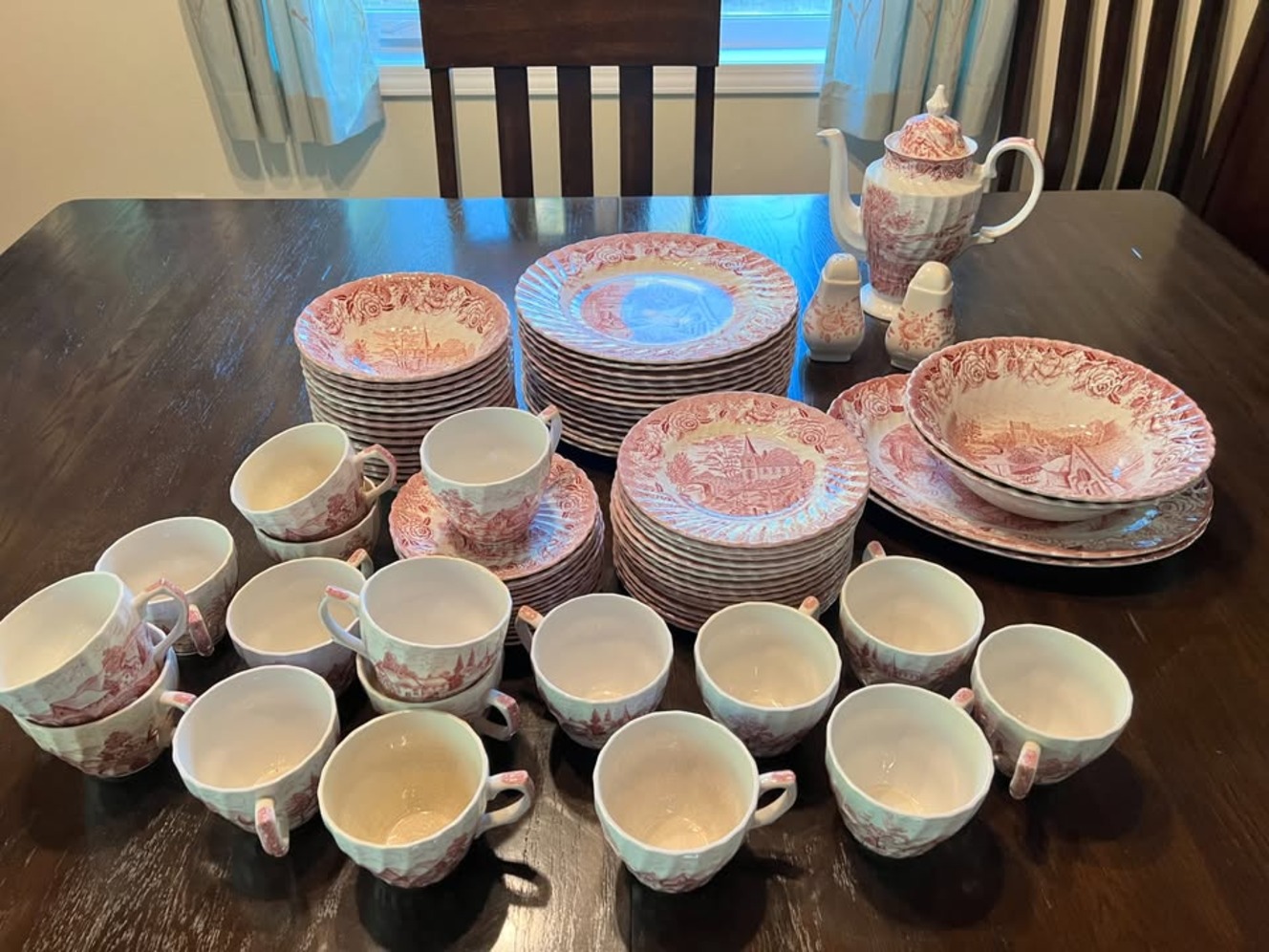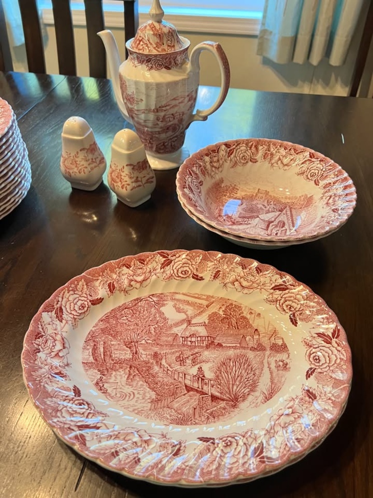 Vintage "English Country Scenes" red and white dinnerware by British Anchor England, Est. 1884. This is a discontinued pattern. All are in fantastic condition, only a couple tea cups have 'tea' staining.