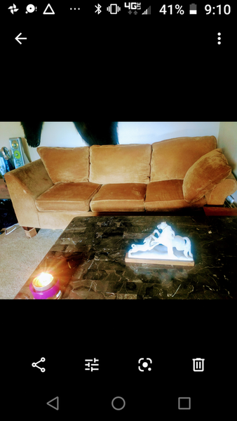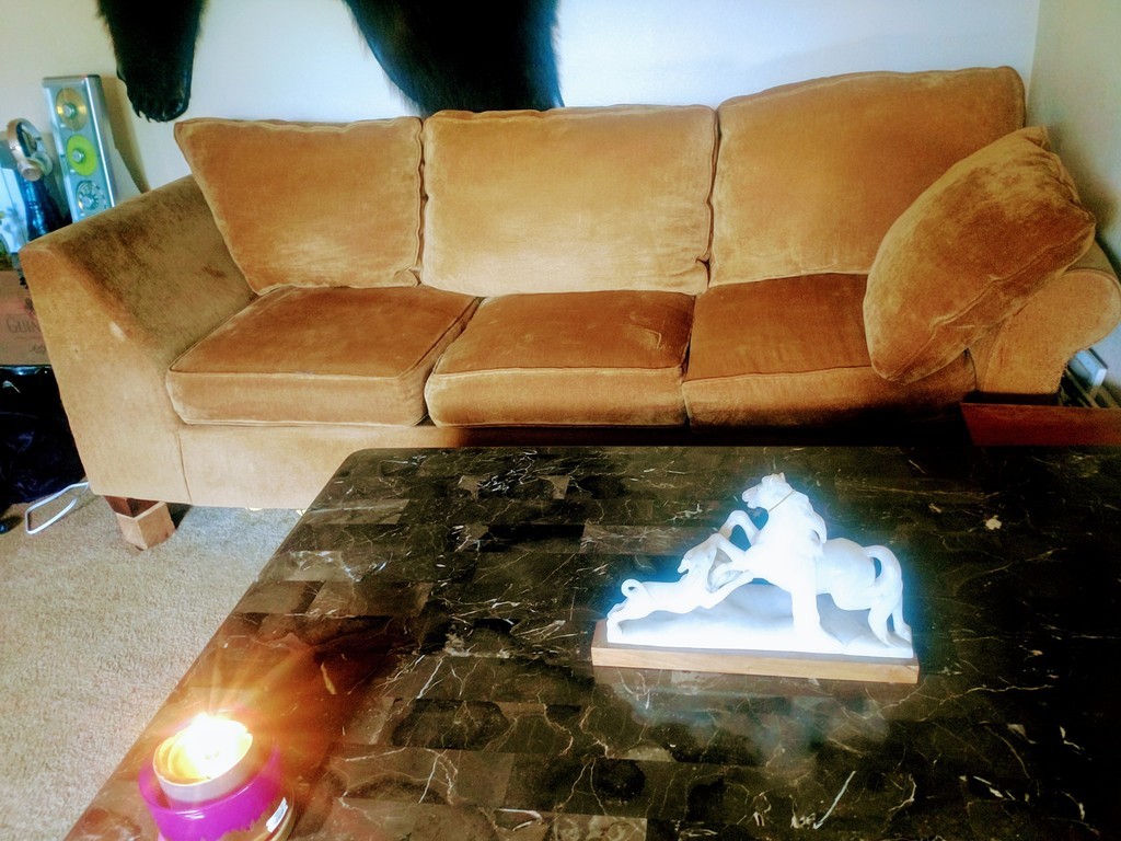 Clean Heavy gold colored cloth sofa from American furniture. Was part of a sectional but I left the shorter sofa in lower 48. It's 4 years old and been in a very clean home. No stains and the cushions come off and can be used to sleep on comfortably. Must pick up in Wasilla. No delivery. Polly