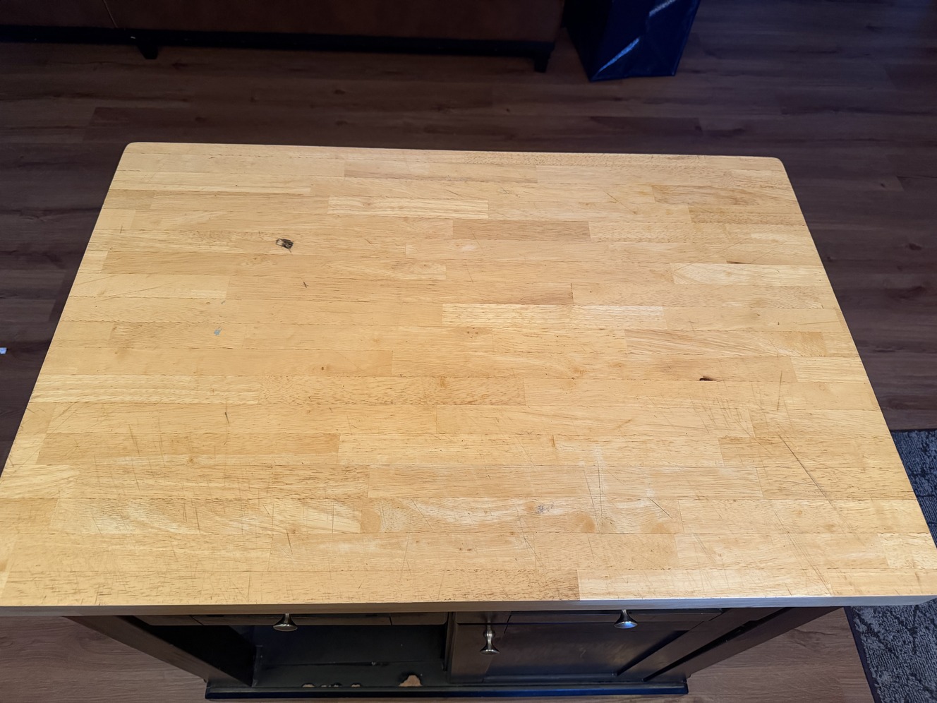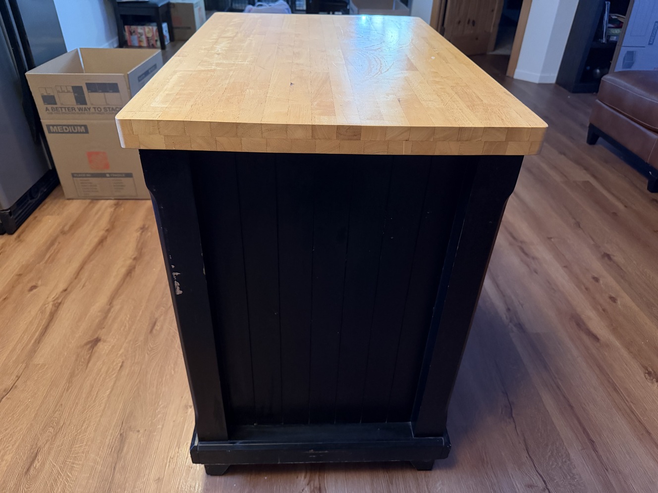 Heavy, solid kitchen island with real wood butcher block top. Very sturdy—this is not particle board junk. One cabinet door, two drawers, and open storage space. Black base with natural wood top. Normal cosmetic wear from use (scratches on top), nothing structural. Great for extra counter space, prep station, or storage. Could use a fresh coat of paint, but otherwise in good shape. Approx size: island-sized (fits standard kitchen; Length-3ft, width-2ft, height-3.5ft) Pick up only