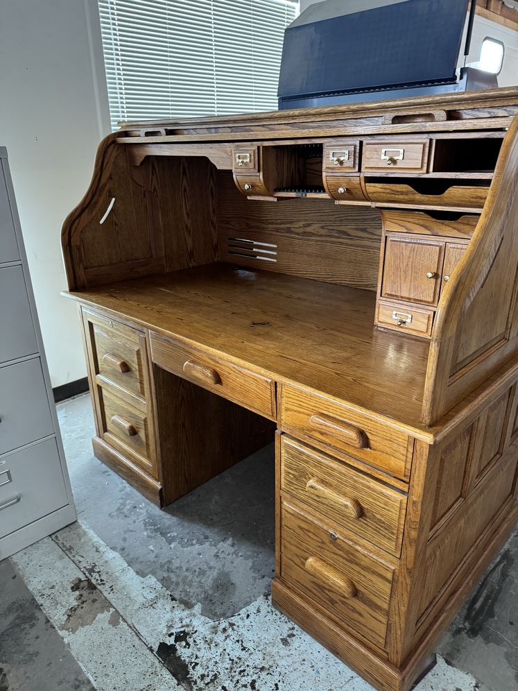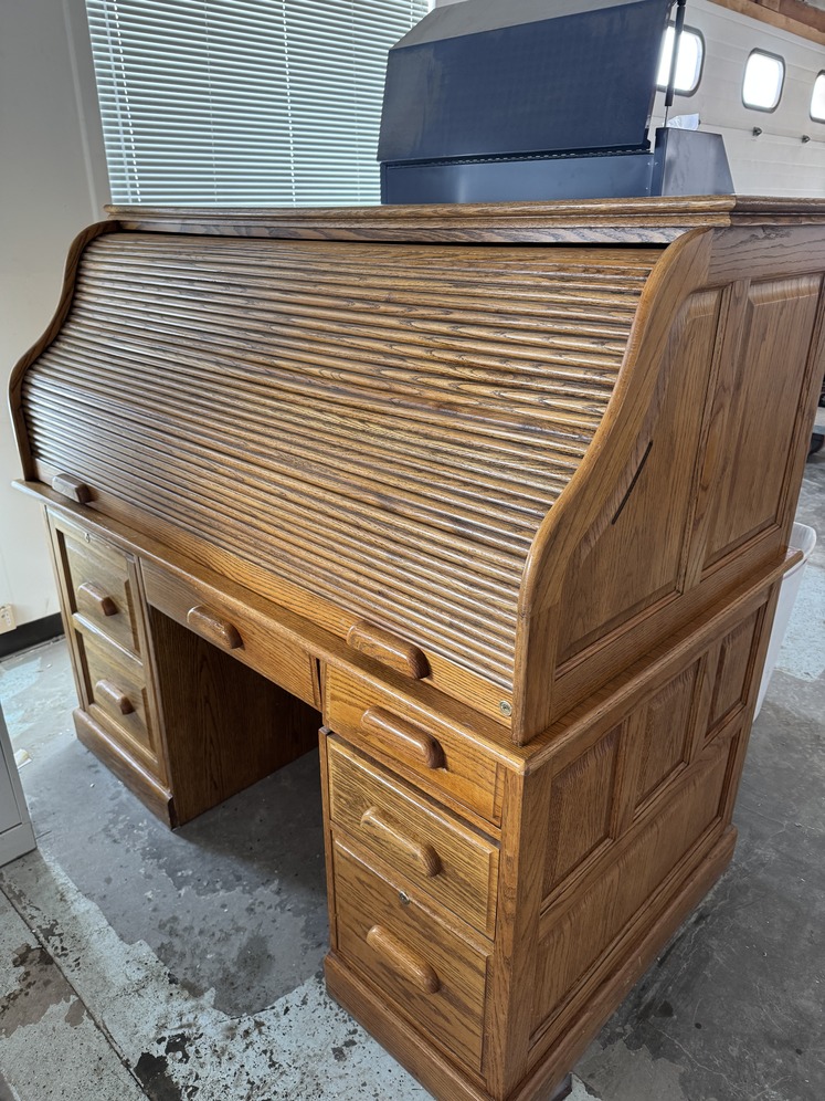 Roll Top Desk, Oak Veneer, 62” long x 36” wide x 56” high Good condition