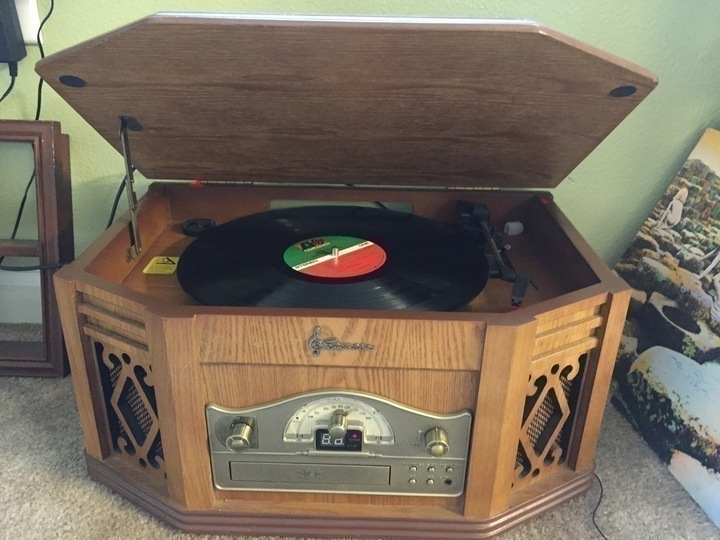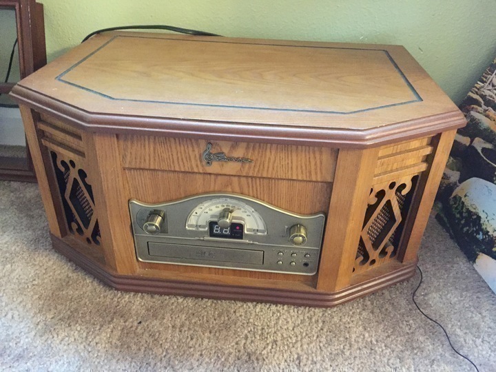 Vintage Reproduction Emerson Stereo System. Home Stereo System with AM/FM Receiver, CD-R/RW Player, Cassette Player and Belt Drive Turntable Model: NR303 Beautiful High Gloss Wood Veneer Cabinetry Motorized, Drawer Loading Compact Disc Player CD-R/RW Playback Compatible One Track / All Tracks Repeat Playback Forward / Reverse Skip Track and High-Speed Music Search 2-Digit LED Track Indicator LED Indicators for Play/Pause and Repeat AM/FM Stereo Radio Lighted Tuning Dial Rotary-Tuning and Volume Controls Rotary Control for Band and Function Selection LED FM Stereo Indicator Side-Mounted, Slot-Loading Stereo Cassette Player Automatic End-of-Tape Shut-off Built-in, Full-Size, 3-Speed, Belt-Driven Stereo Turntable Auto-Start, Auto-Stop, Auto Tone Arm Return, and Cue Control Ceramic Cartridge with Jeweled Stylus 45 RPM Adapter Included Wide-Range 3 Speakers Stereo Headphone Jack Built-In AM and FM Antennas Dimensions: 19 W x 9.25 H x 12.8 D