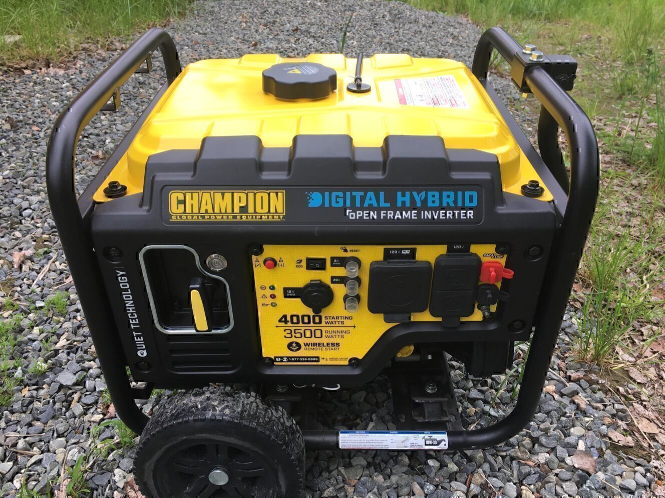 Champion brand digital hybrid, open frame inverter. 4000 starting watts - 3500 running watts. Perfect clean power for a RV and sensitive electronics RV ready w/ 30 amp outlet Wireless remote start Powered recoil start Quiet technology w/ economy mode Comes w/ a handle and wheels for easy transport In like new condition, has about 50-75 hours on it. Has had 2 oil changes on it.