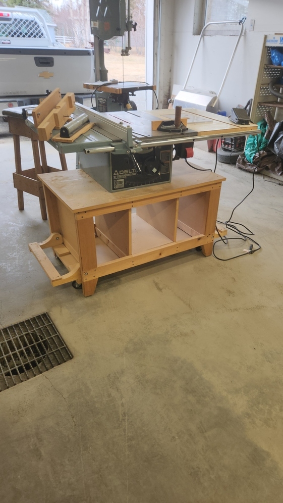 Delta Contractors Saw II Table Saw. 10 inch wheel. On rolling wood cabinet. 5 extra wheels, don't know condition of extra wheels. Surface of table also has Bosh router. Used only in home hobby wood work. Cash only. Price includes Saw, Router and cabinet. If you come to look and buy bring help to load. Land line phone below, no texts please.
