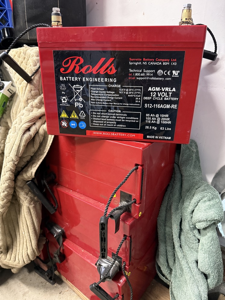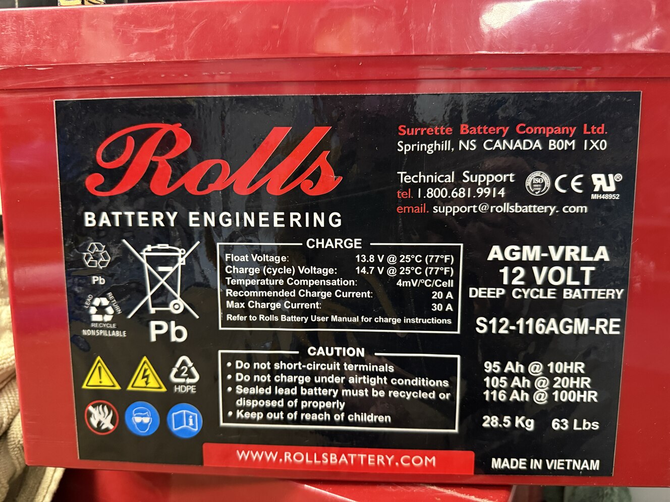 Rolls S12-116-AGM-RE These were in a PV system for 6months then went to Lithium. All batteries are in excellent condition and stored appropriately. All read 13+ volts. Weight: 63# ea. $280 ea or $2,000 for all 8 batteries. Call or text.