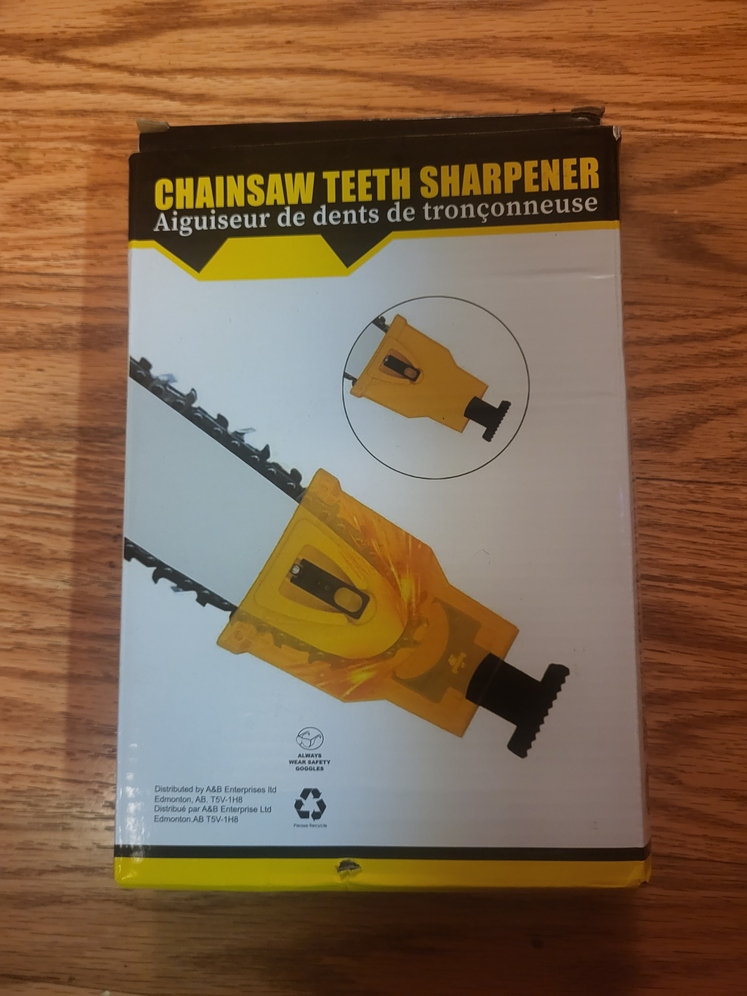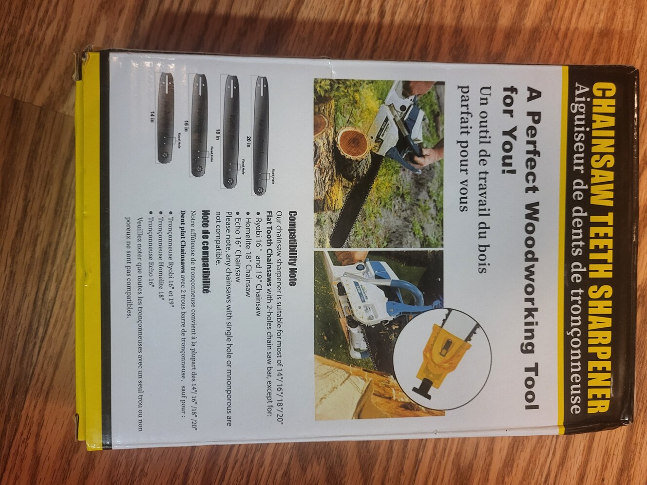 Chainsaw Teeth Sharpener. New In Box. Chainsaw Bar must have two holes at upper end for mounting. Does not work on Ryobi, Homelite, and Echo chainsaws.