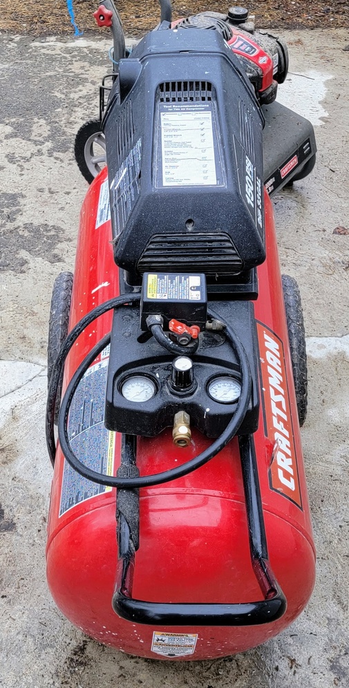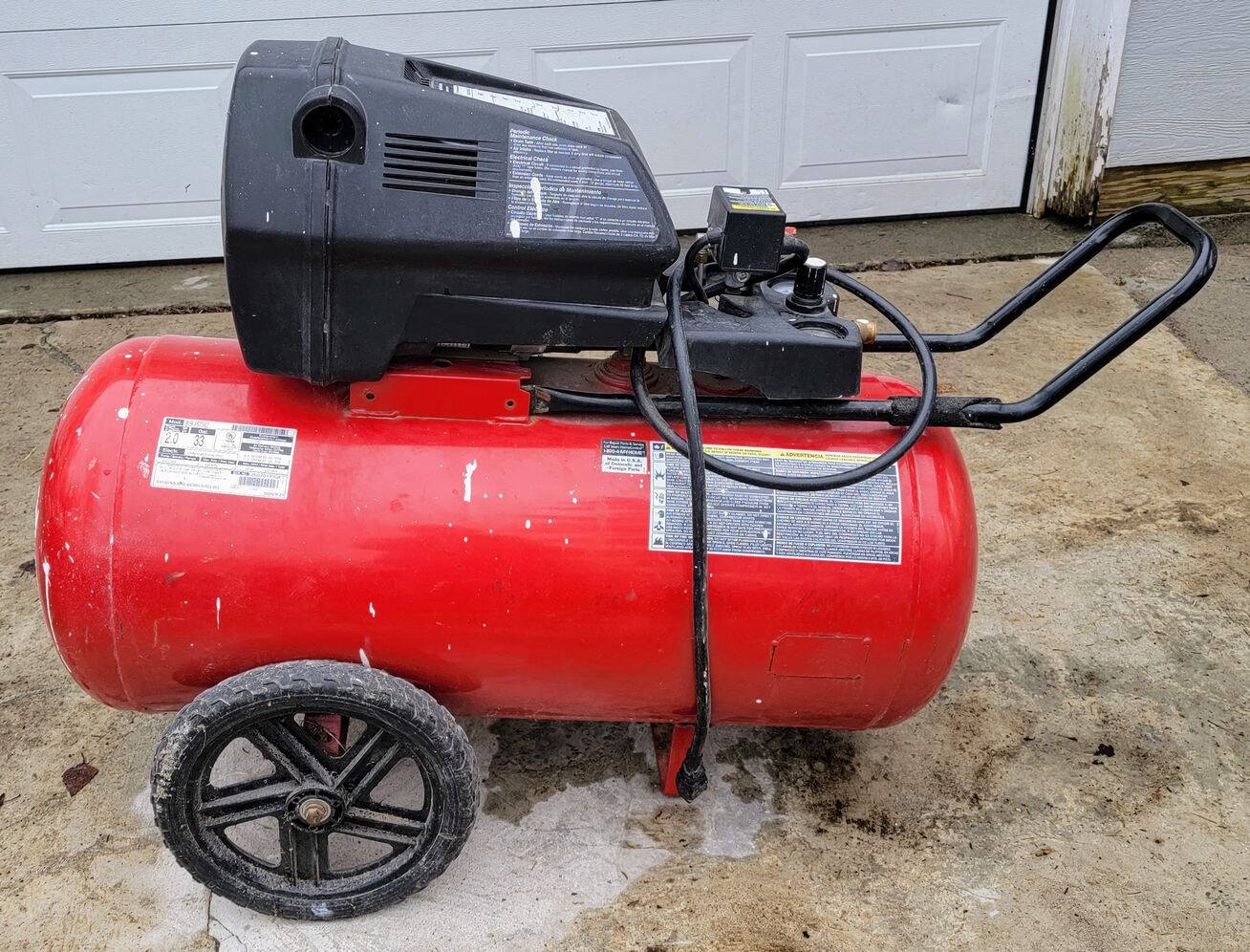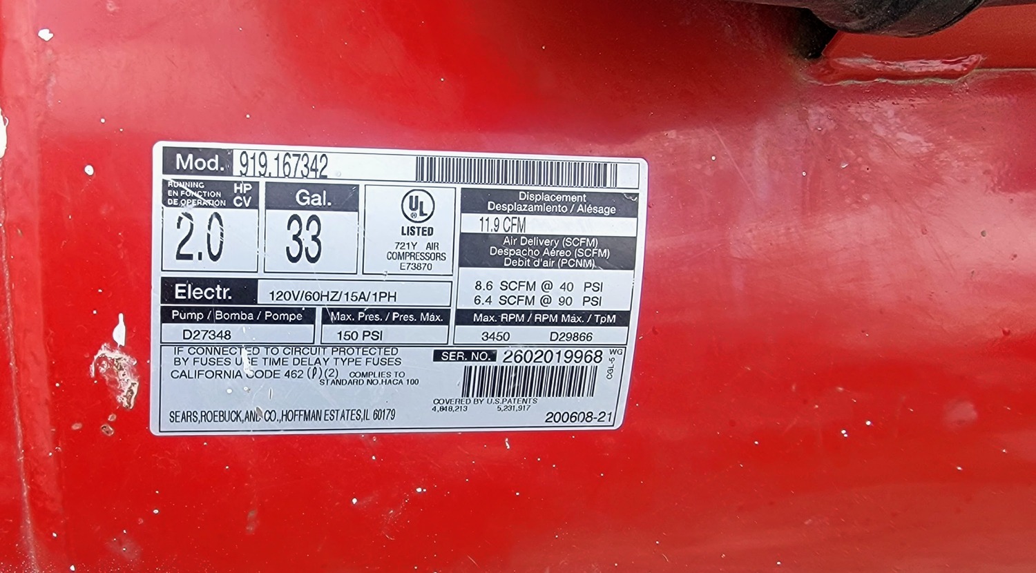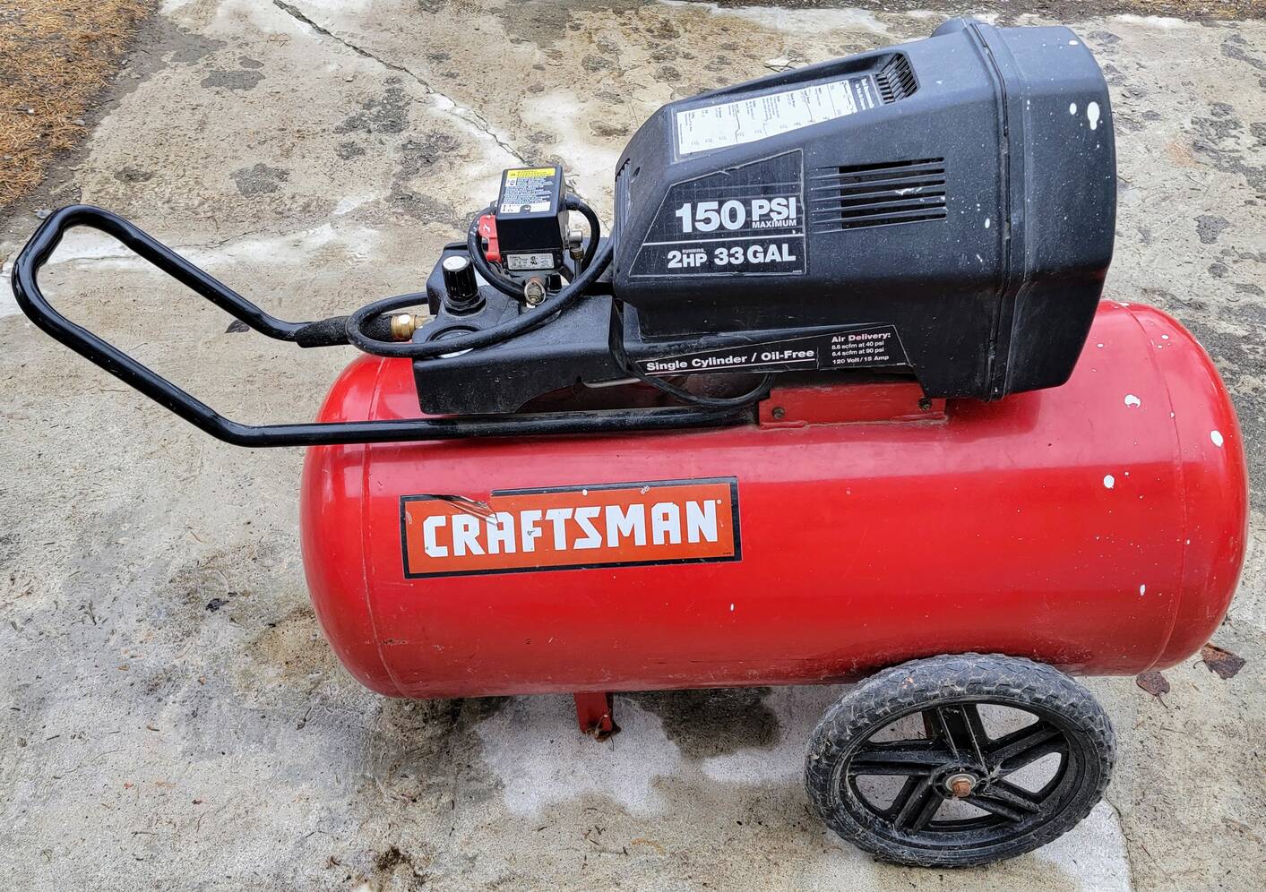 Runs good, builds and holds pressure. 33 gallon tank 2.0 HP 150 PSI max 6.4 SCFM @ 90 PSI Includes hose 120V plug-in Downsizing, getting ready for a garage sale