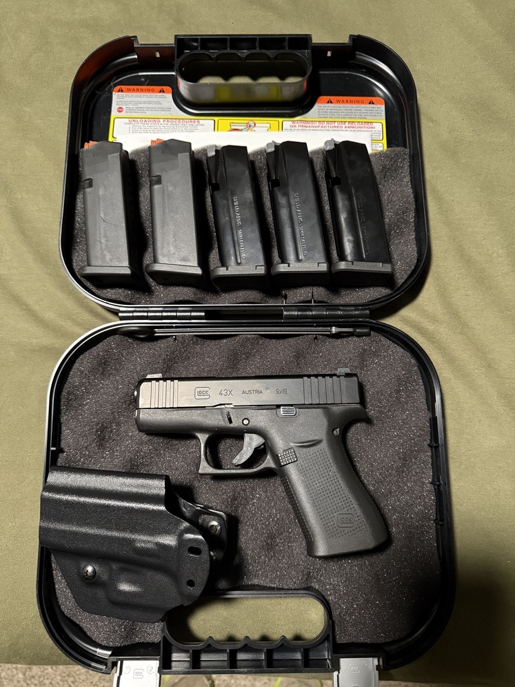 Glock 43x with shield arms mag release, 3 shield arms 15round mags, 2 factory Glock mags, 5 mags in total. Comes with a kydex ambidextrous holster. Has about 500 rounds through it. Nothing wrong with it just need to sell it. Asking $550.00