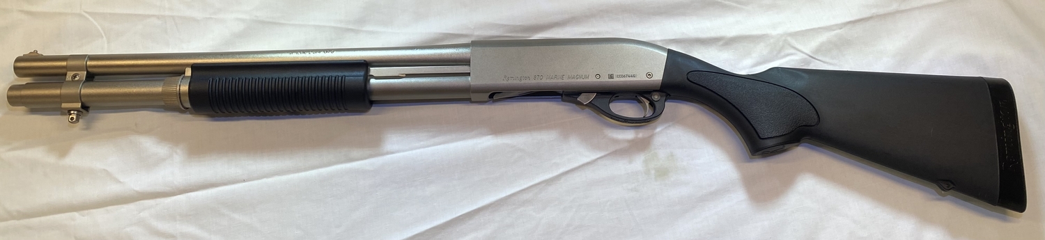 Hard to find discontinued Remington Marine Magnum. 12 gauge, perfect for bear defense. This example is in excellent "like-new" condition, glassy bore.