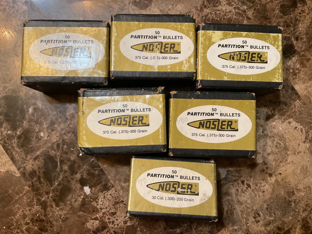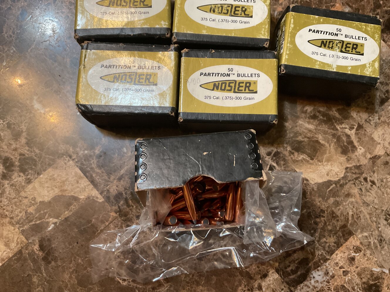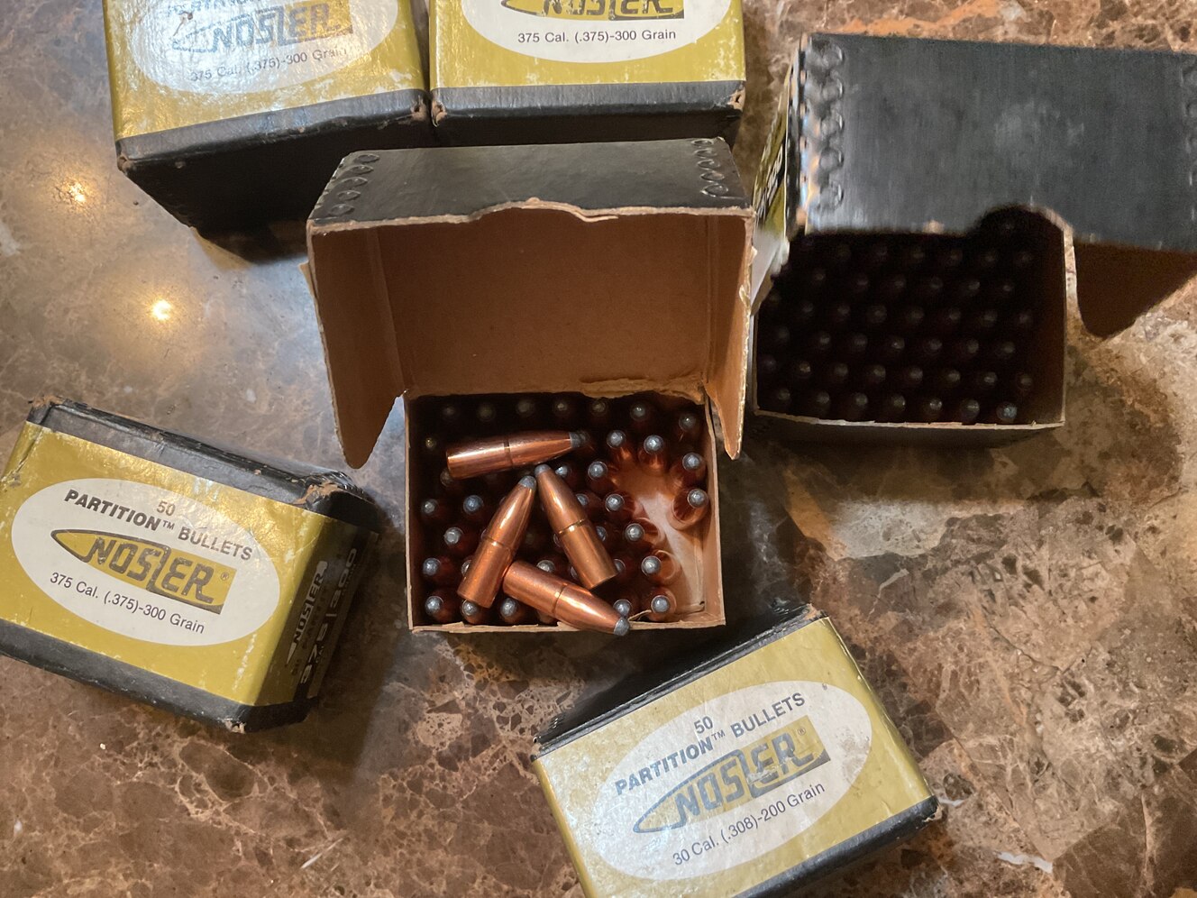 I have 5 boxes of Nosler partition bullets 375 caliber 300 grain. 50/box 1 box 30 caliber 200 grain. 50 in the box. Asking 550.00