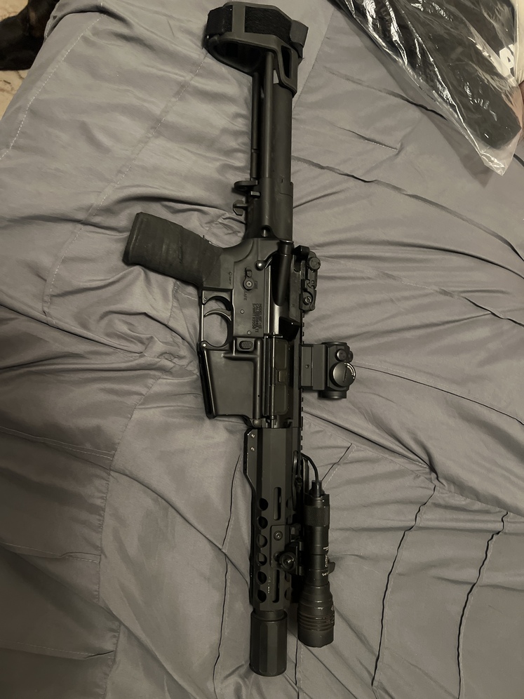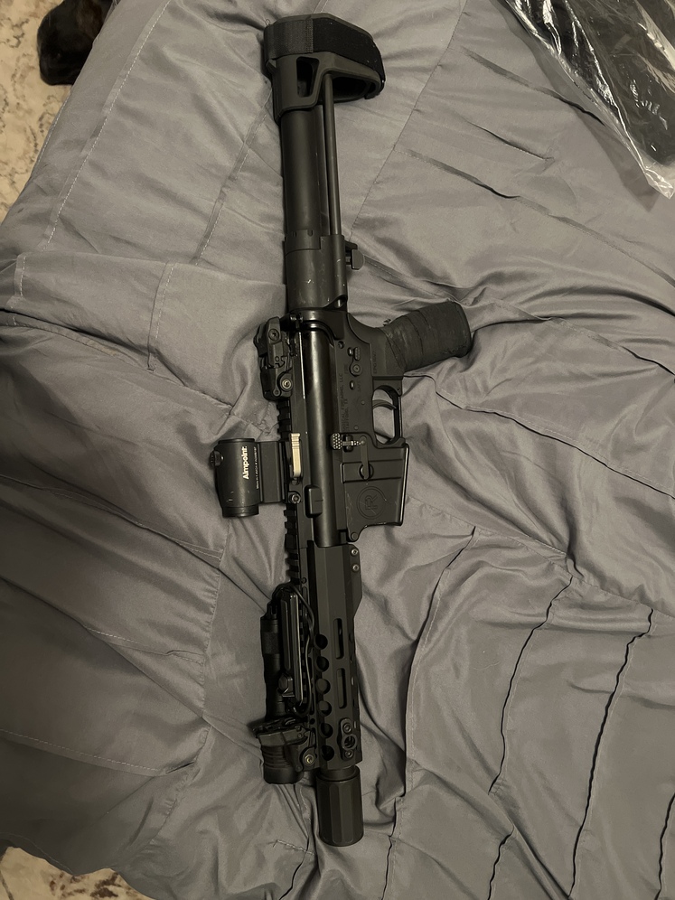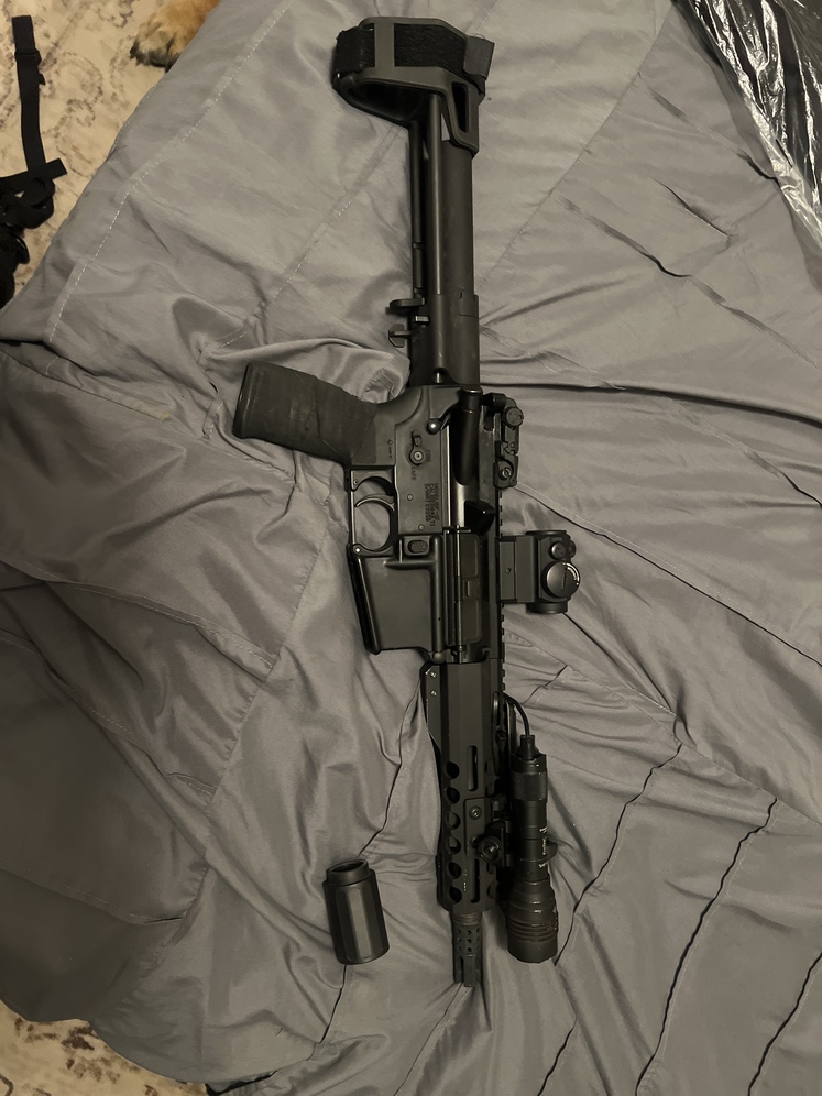 It’s a 7.5 ar 15 5.56 Comes with maxim buttstock or pistol brace. Aimpoint 4MOA red dot. Streamlight protac weapon light with pressure pad. Magpull flip up front and rear sights. Flash hider cann. 2 30 round mags. Selling to make room in my safe and new toys. Ran about any kind of ammo and never had a malfunction. Fits in those go bags or use as a truck gun. $900 or best offer. Shoot me a text if you have any questions. 907-917-6096 THANKS