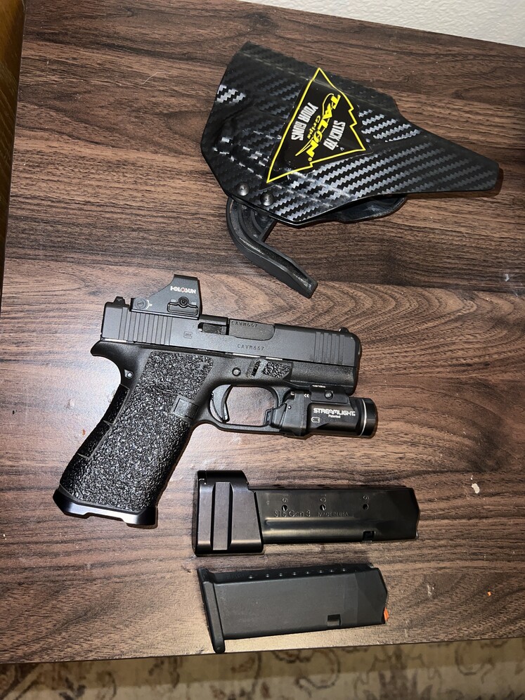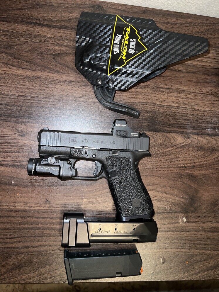 Glock 43x mos with Holoson 407K red dot, streamlight TLR-7 weapon light 2 mags 1 ten round mag 1 18 round shields arms mag. Comes with original case and hardware. Comes with iwb holster in the picture $800 firm…Txt me