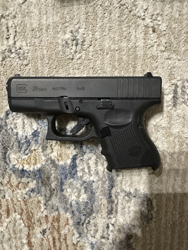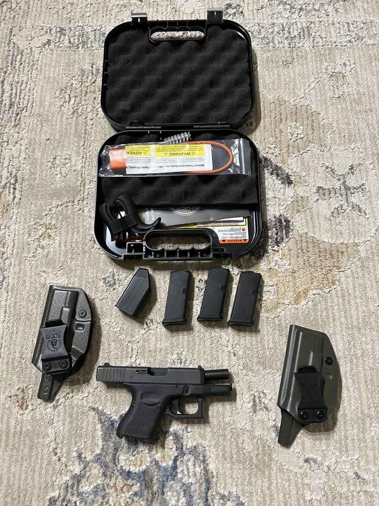 This is the baby Glock that will take your Glock 19/17/45/19X/34 magazines. So whatever 9mm Glock you have as your main, this is a great little backup. I have three 10-rd mags to go with it, 2 identical IWB holsters (I think they costed $50 each), and all of the original packaging, paperwork, and Glock stuff.