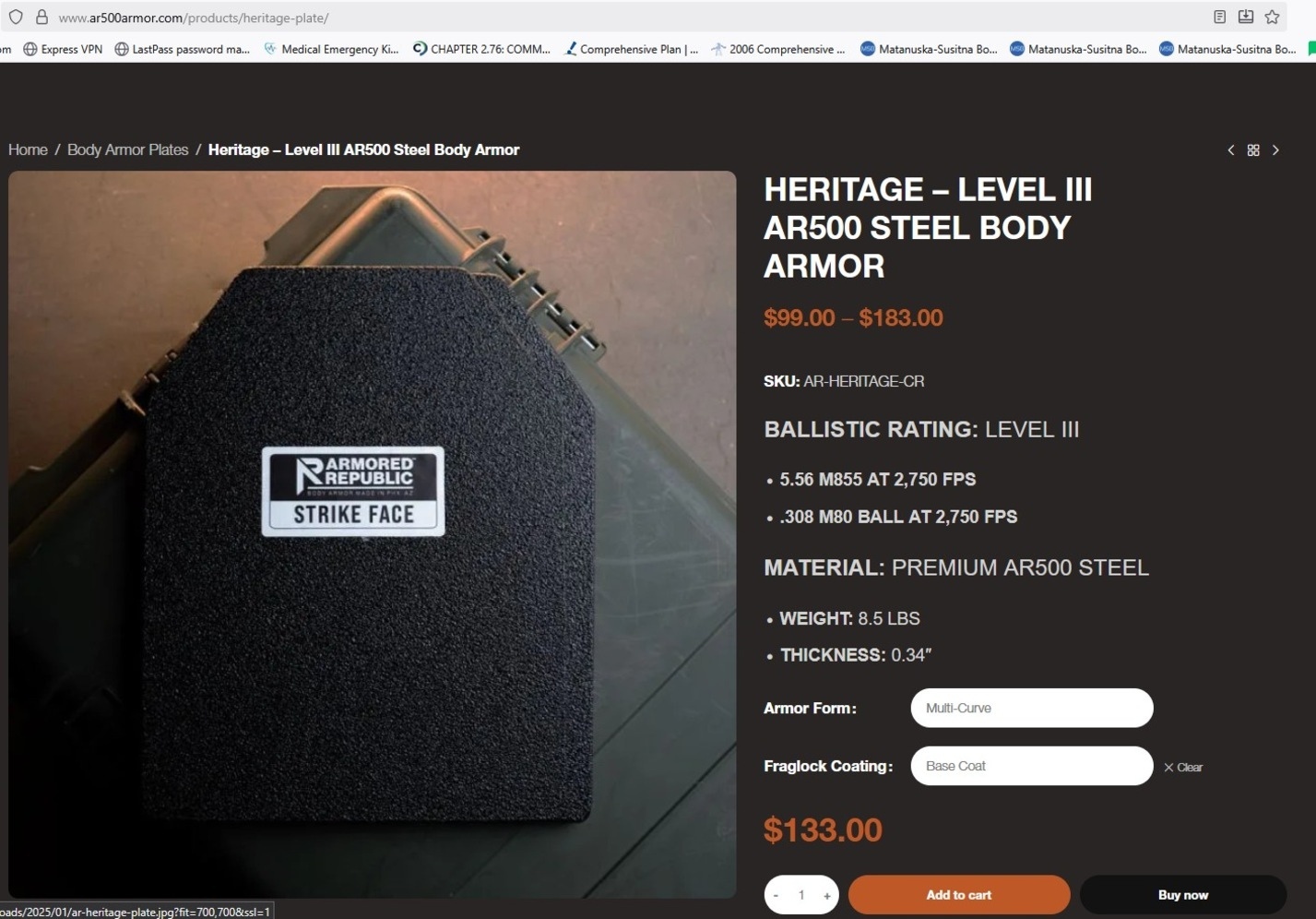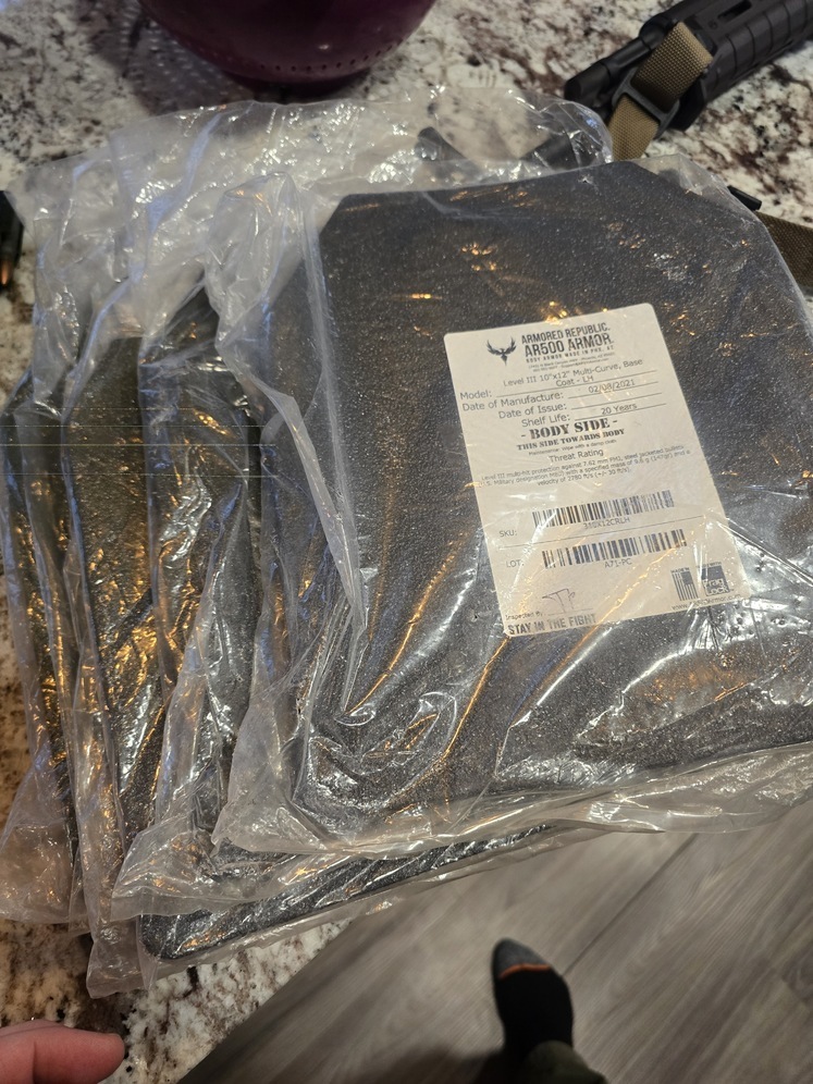 I have 6 BRAND NEW AR500 (Armored Republic) Level III plates w/ defragmentation Coating. Selling 1. $175 one plate 2. $300 for two plates 3. $$575 for four plates 4. $850 for all six plates. These are new still in plastic bags.